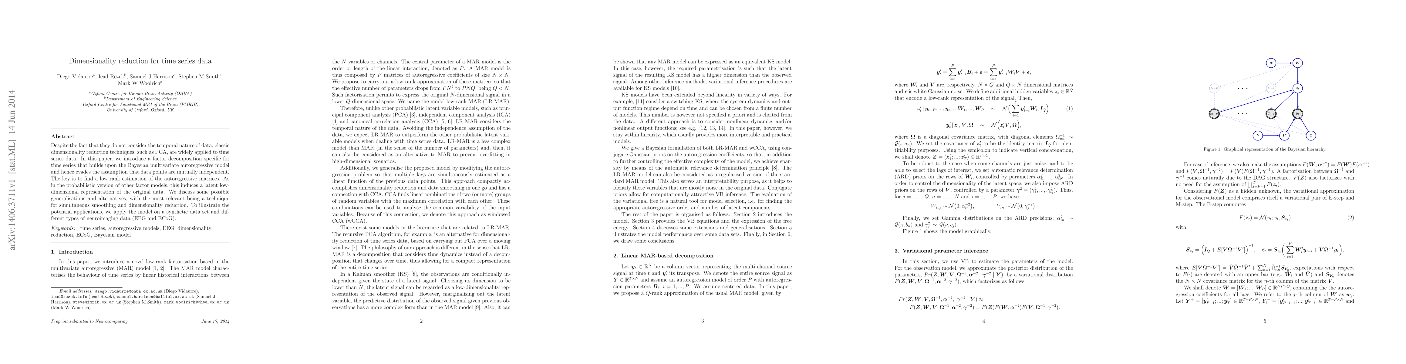 This paper proposes a Bayesian multivariate autoregressive model for dimensionality reduction in time series data, avoiding the assumption of independence between data points. It introduces a low-rank estimation of autoregressive matrices to achieve a latent low-dimensional representation and demonstrates its application on synthetic and neuroimaging data.