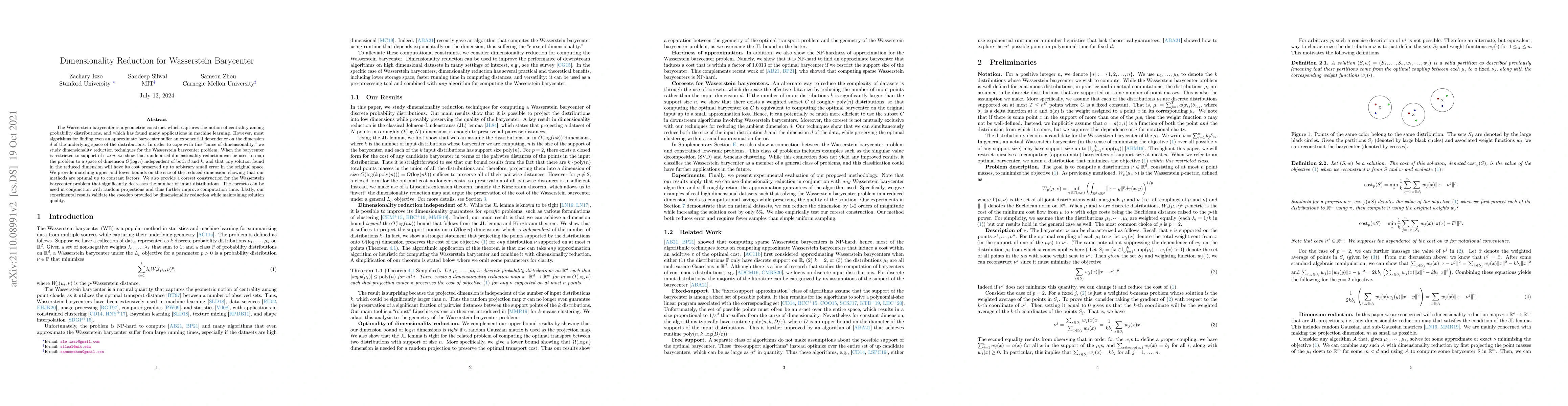 This paper proposes dimensionality reduction techniques to address the "curse of dimensionality" in computing Wasserstein barycenters, showing that randomized dimensionality reduction can reduce the problem's dimension to $O(\log n)$ independent of the original space's dimension. Experimental results confirm the effectiveness of these methods in speeding up computations while preserving solution quality.