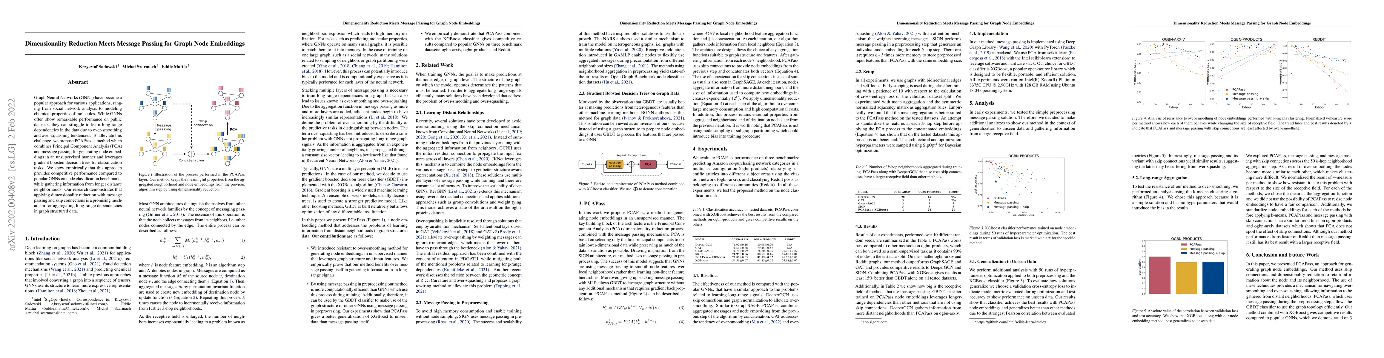 This paper proposes PCAPass, a method combining PCA and message passing for unsupervised graph node embeddings, which uses gradient boosted decision trees for classification. The approach effectively captures long-range dependencies, achieving competitive performance on node classification benchmarks compared to traditional GNNs.