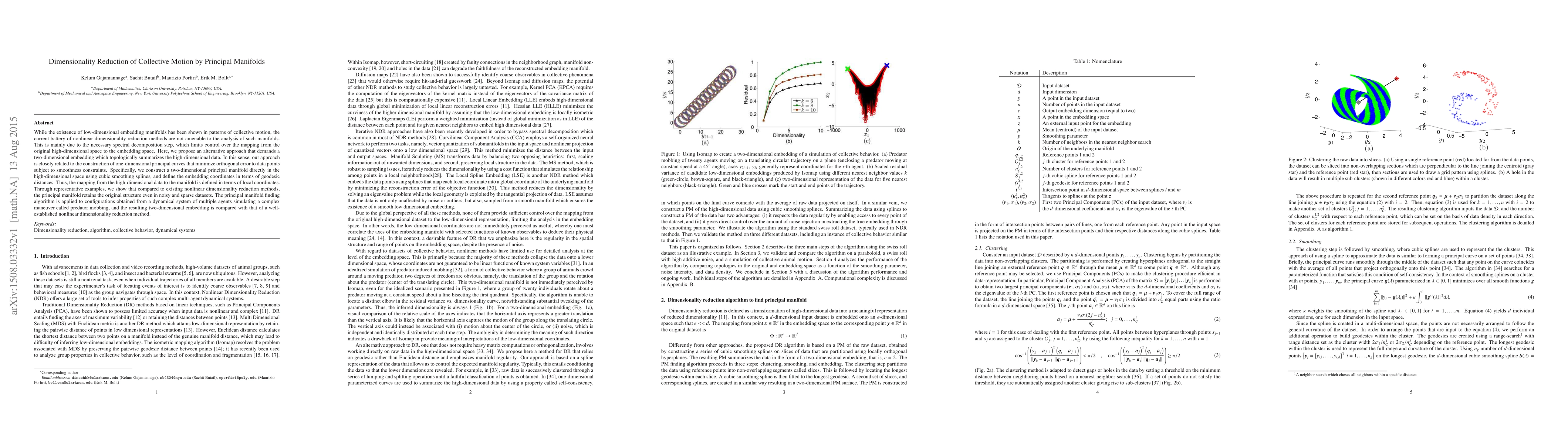 This paper proposes a novel method for dimensionality reduction of collective motion data, constructing a two-dimensional principal manifold using cubic smoothing splines and geodesic distances. The approach effectively captures the underlying structure of high-dimensional data, outperforming existing nonlinear methods, as demonstrated through simulations of predator mobbing.