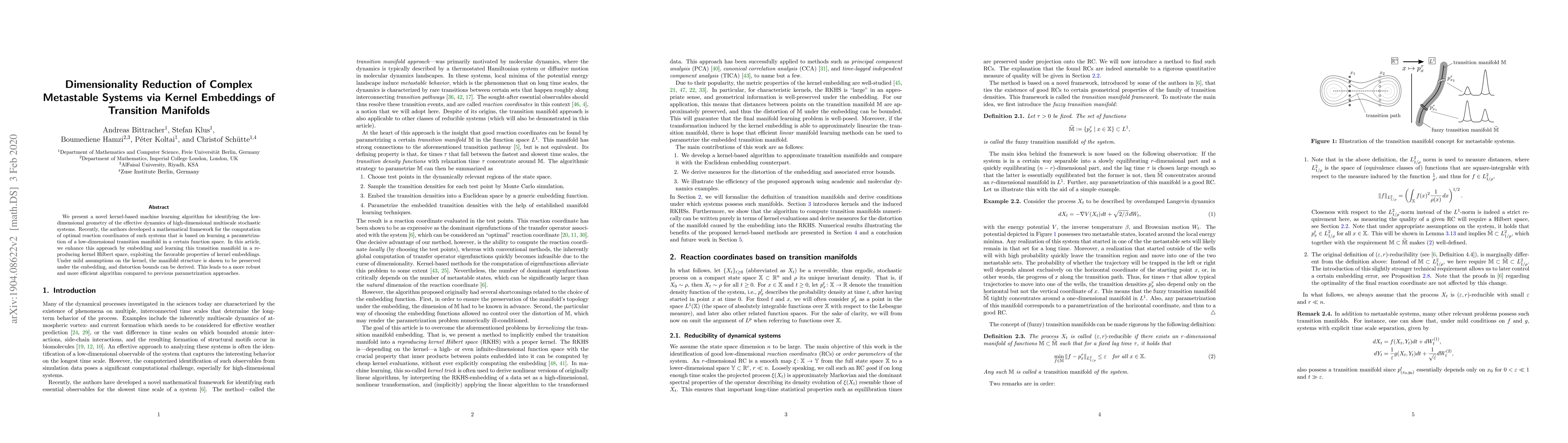 We present a novel kernel-based machine learning algorithm for identifying the low-dimensional geometry of the effective dynamics of high-dimensional multiscale stochastic systems. Recently, the authors developed a mathematical framework for the computation of optimal reaction coordinates of such systems that is based on learning a parametrization of a low-dimensional transition manifold in a certain function space. In this article, we enhance this approach by embedding and learning this transition manifold in a reproducing kernel Hilbert space, exploiting the favorable properties of kernel embeddings. Under mild assumptions on the kernel, the manifold structure is shown to be preserved under the embedding, and distortion bounds can be derived. This leads to a more robust and more efficient algorithm compared to previous parametrization approaches.