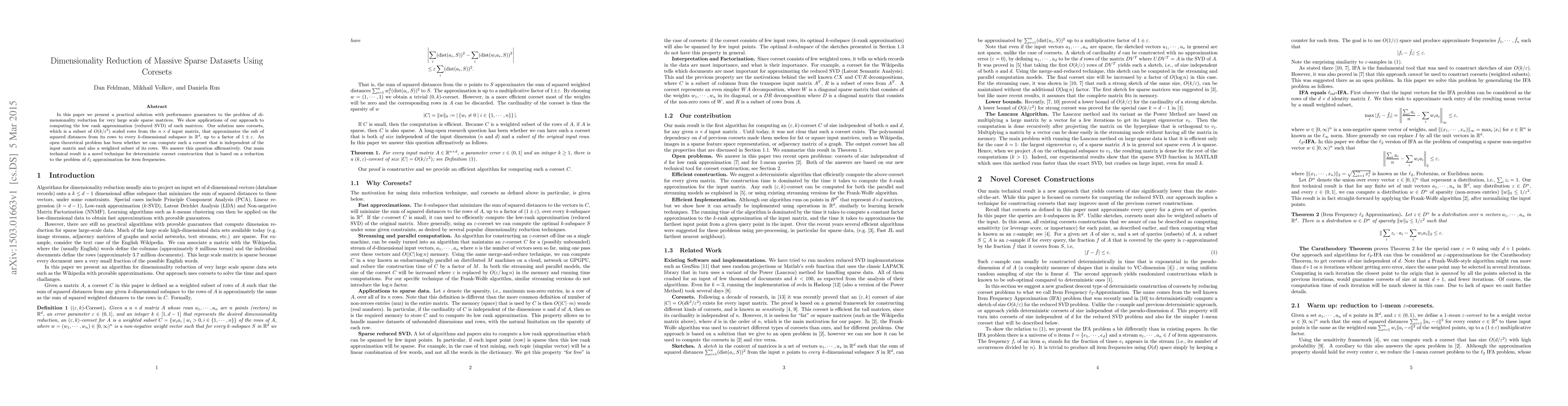 In this paper we present a practical solution with performance guarantees to the problem of dimensionality reduction for very large scale sparse matrices. We show applications of our approach to computing the low rank approximation (reduced SVD) of such matrices. Our solution uses coresets, which is a subset of $O(k/\eps^2)$ scaled rows from the $n\times d$ input matrix, that approximates the sub of squared distances from its rows to every $k$-dimensional subspace in $\REAL^d$, up to a factor of $1\pm\eps$. An open theoretical problem has been whether we can compute such a coreset that is independent of the input matrix and also a weighted subset of its rows. %An open practical problem has been whether we can compute a non-trivial approximation to the reduced SVD of very large databases such as the Wikipedia document-term matrix in a reasonable time. We answer this question affirmatively. % and demonstrate an algorithm that efficiently computes a low rank approximation of the entire English Wikipedia. Our main technical result is a novel technique for deterministic coreset construction that is based on a reduction to the problem of $\ell_2$ approximation for item frequencies.