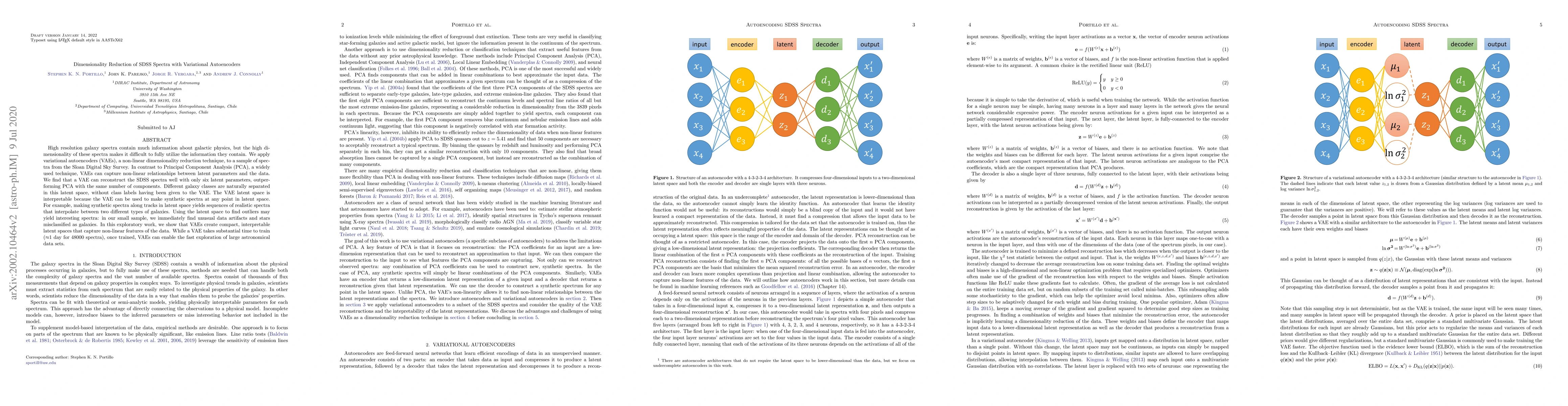 This study applies variational autoencoders (VAEs) for dimensionality reduction of high-resolution SDSS galaxy spectra, effectively capturing non-linear relationships. The VAEs outperform PCA in reconstructing spectra with fewer latent parameters, naturally separating galaxy classes and enabling synthetic spectrum generation, suggesting potential for identifying outliers and artifacts in large astronomical datasets.