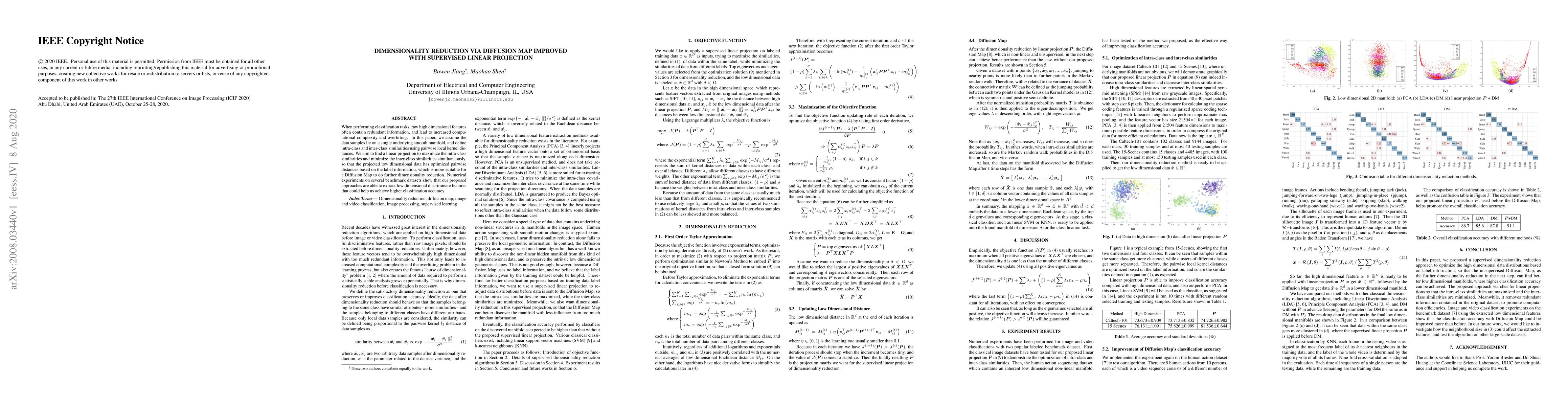 This paper proposes a method for dimensionality reduction that combines Diffusion Map with a supervised linear projection to enhance classification tasks. By maximizing intra-class and minimizing inter-class similarities, the approach extracts low-dimensional features that improve classification accuracy, as demonstrated through experiments on benchmark datasets.