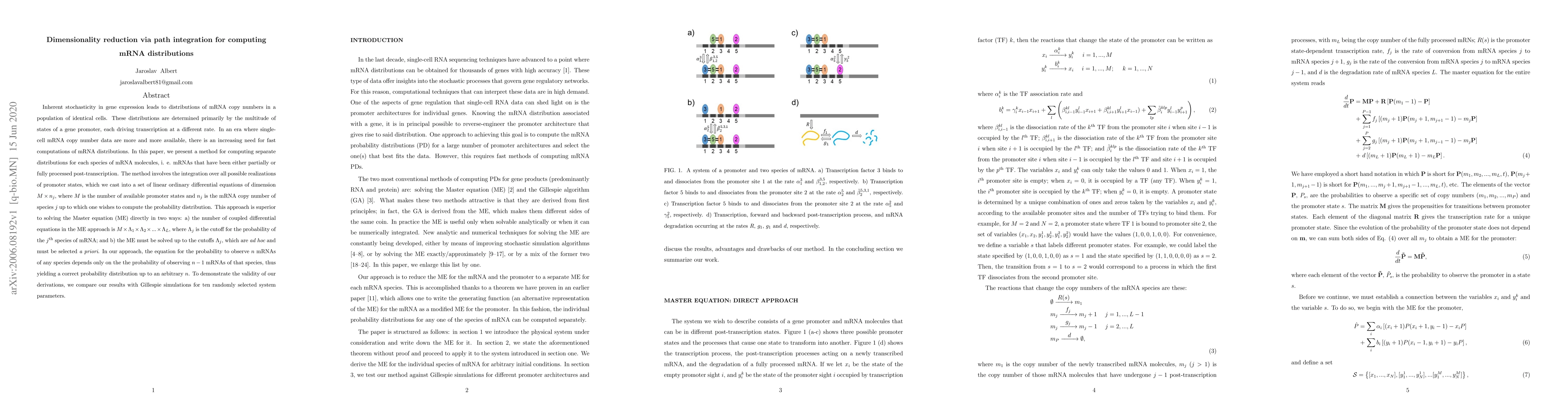 Inherent stochasticity in gene expression leads to distributions of mRNA copy numbers in a population of identical cells. These distributions are determined primarily by the multitude of states of a gene promoter, each driving transcription at a different rate. In an era where single-cell mRNA copy number data are more and more available, there is an increasing need for fast computations of mRNA distributions. In this paper, we present a method for computing separate distributions for each species of mRNA molecules, i. e. mRNAs that have been either partially or fully processed post-transcription. The method involves the integration over all possible realizations of promoter states, which we cast into a set of linear ordinary differential equations of dimension $M\times n_j$, where $M$ is the number of available promoter states and $n_j$ is the mRNA copy number of species $j$ up to which one wishes to compute the probability distribution. This approach is superior to solving the Master equation (ME) directly in two ways: a) the number of coupled differential equations in the ME approach is $M\times\Lambda_1\times\Lambda_2\times ...\times\Lambda_L$, where $\Lambda_j$ is the cutoff for the probability of the $j^{\text{th}}$ species of mRNA; and b) the ME must be solved up to the cutoffs $\Lambda_j$, which are {\it ad hoc} and must be selected {\it a priori}. In our approach, the equation for the probability to observe $n$ mRNAs of any species depends only on the the probability of observing $n-1$ mRNAs of that species, thus yielding a correct probability distribution up to an arbitrary $n$. To demonstrate the validity of our derivations, we compare our results with Gillespie simulations for ten randomly selected system parameters.