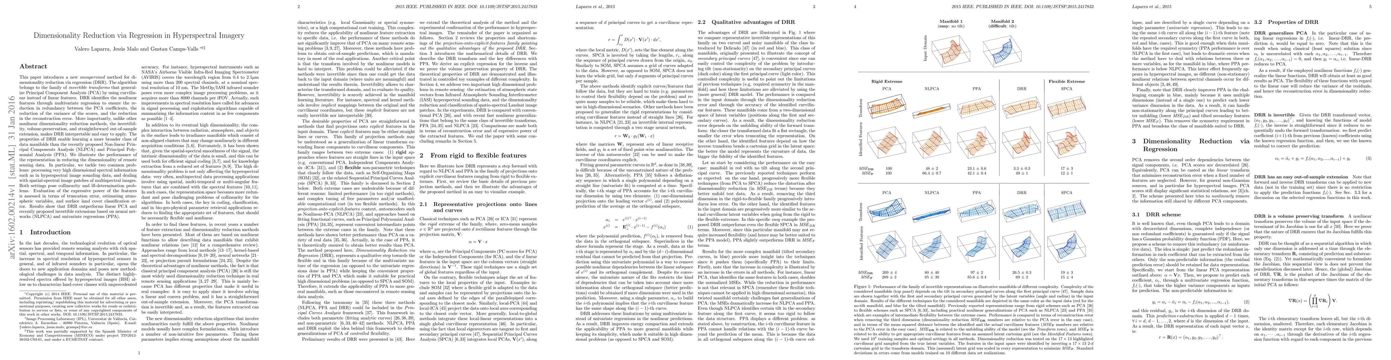 This paper proposes a new unsupervised dimensionality reduction method called DRR, which uses regression to identify nonlinear features, offering invertibility and volume-preservation. DRR outperforms linear PCA and other nonlinear methods in reducing hyperspectral imagery dimensionality, addressing collinearity and ill-determination issues.