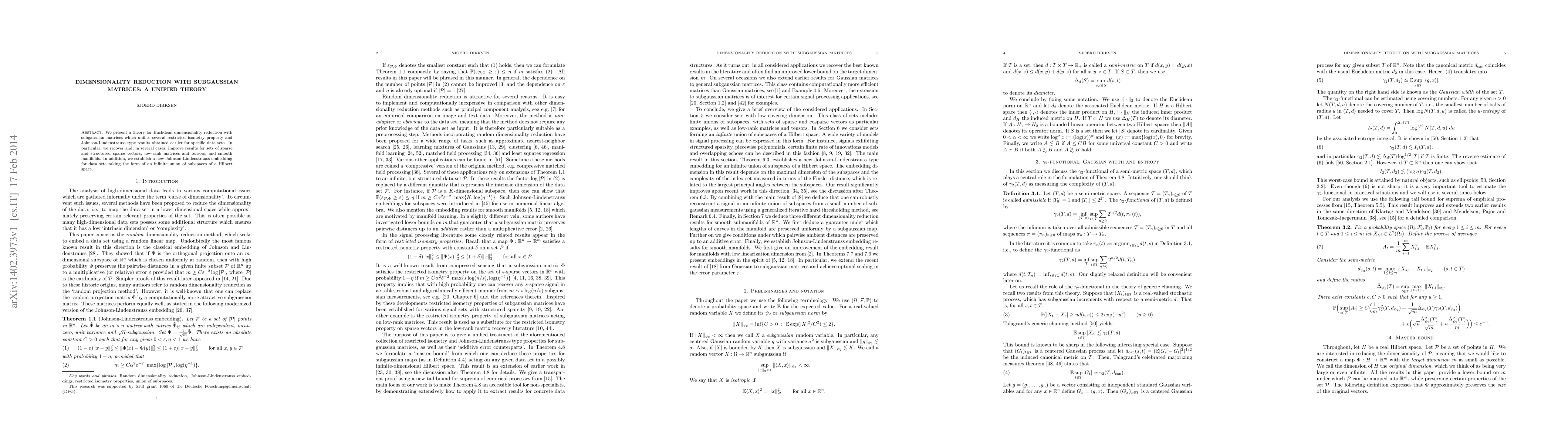 This paper presents a unified theory for dimensionality reduction using subgaussian matrices, improving and recovering previous results for specific data sets, including sparse vectors, low-rank matrices, and smooth manifolds.