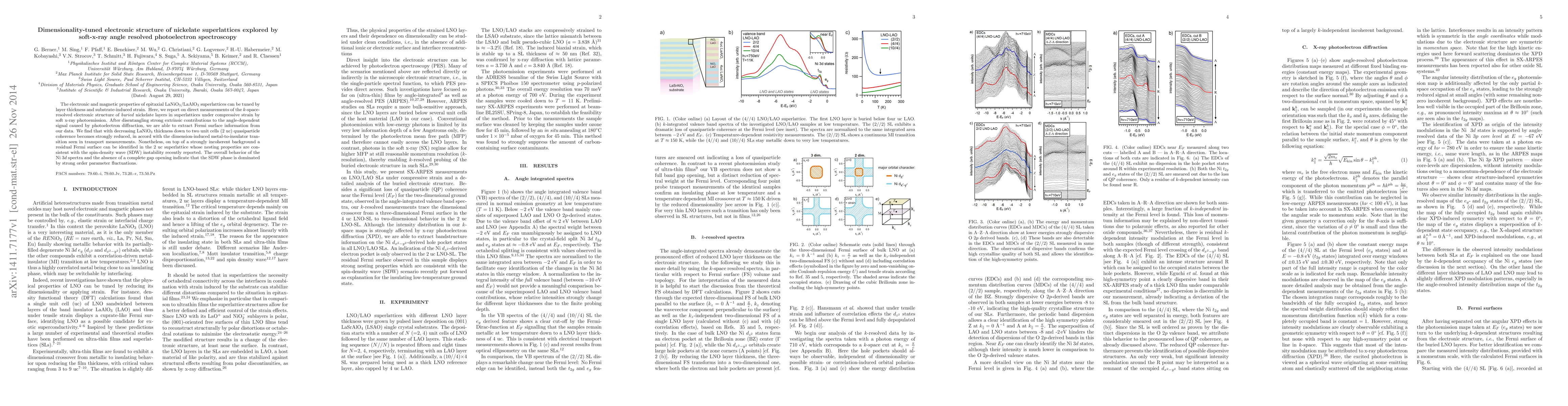 The electronic and magnetic properties of epitaxial LaNiO3/LaAlO3 superlattices can be tuned by layer thickness and substrate-induced strain. Here, we report on direct measurements of the k-space-resolved electronic structure of buried nickelate layers in superlattices under compressive strain by soft x-ray photoemission. After disentangling strong extrinsic contributions to the angle-dependent signal caused by photoelectron diffraction, we are able to extract Fermi surface information from our data. We find that with decreasing LaNiO3 thickness down to two unit cells (2 uc) quasiparticle coherence becomes strongly reduced, in accord with the dimension-induced metal-to-insulator transition seen in transport measurements. Nonetheless, on top of a strongly incoherent background a residual Fermi surface can be identified in the 2 uc superlattice whose nesting properties are consistent with the spin-density wave (SDW) instability recently reported. The overall behavior of the Ni 3d spectra and the absence of a complete gap opening indicate that the SDW phase is dominated by strong order parameter fluctuations.
