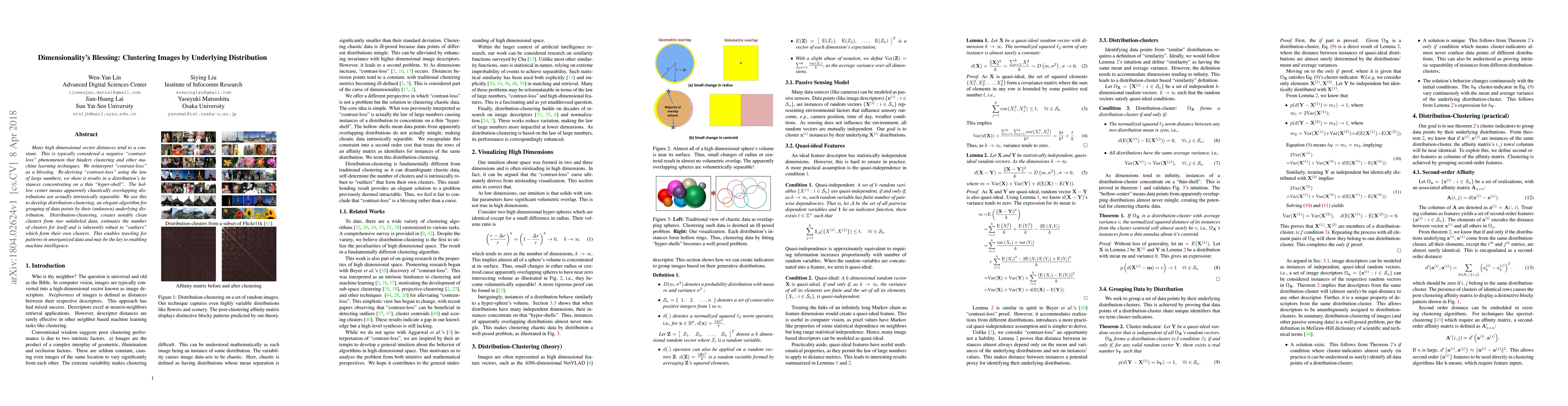 Many high dimensional vector distances tend to a constant. This is typically considered a negative "contrast-loss" phenomenon that hinders clustering and other machine learning techniques. We reinterpret "contrast-loss" as a blessing. Re-deriving "contrast-loss" using the law of large numbers, we show it results in a distribution's instances concentrating on a thin "hyper-shell". The hollow center means apparently chaotically overlapping distributions are actually intrinsically separable. We use this to develop distribution-clustering, an elegant algorithm for grouping of data points by their (unknown) underlying distribution. Distribution-clustering, creates notably clean clusters from raw unlabeled data, estimates the number of clusters for itself and is inherently robust to "outliers" which form their own clusters. This enables trawling for patterns in unorganized data and may be the key to enabling machine intelligence.