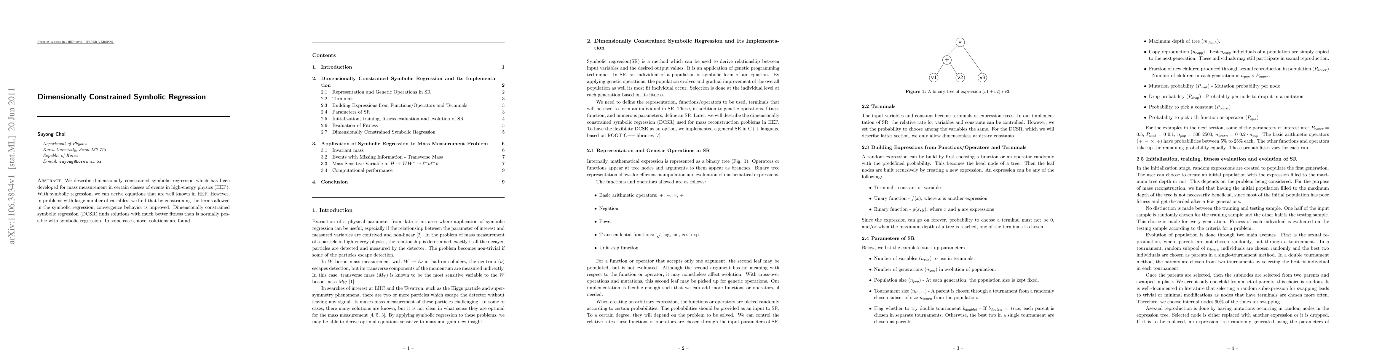 We describe dimensionally constrained symbolic regression which has been developed for mass measurement in certain classes of events in high-energy physics (HEP). With symbolic regression, we can derive equations that are well known in HEP. However, in problems with large number of variables, we find that by constraining the terms allowed in the symbolic regression, convergence behavior is improved. Dimensionally constrained symbolic regression (DCSR) finds solutions with much better fitness than is normally possible with symbolic regression. In some cases, novel solutions are found.