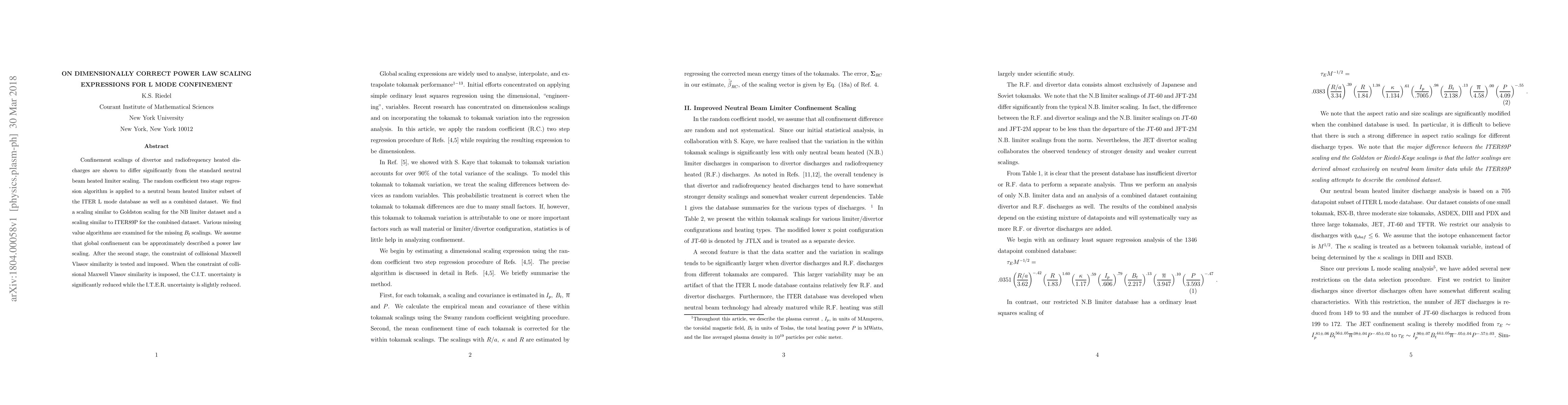 The paper presents a method for deriving dimensionally correct power law scaling expressions for L-mode confinement using a two-stage regression algorithm and imposing collisional Maxwell Vlasov similarity constraints.