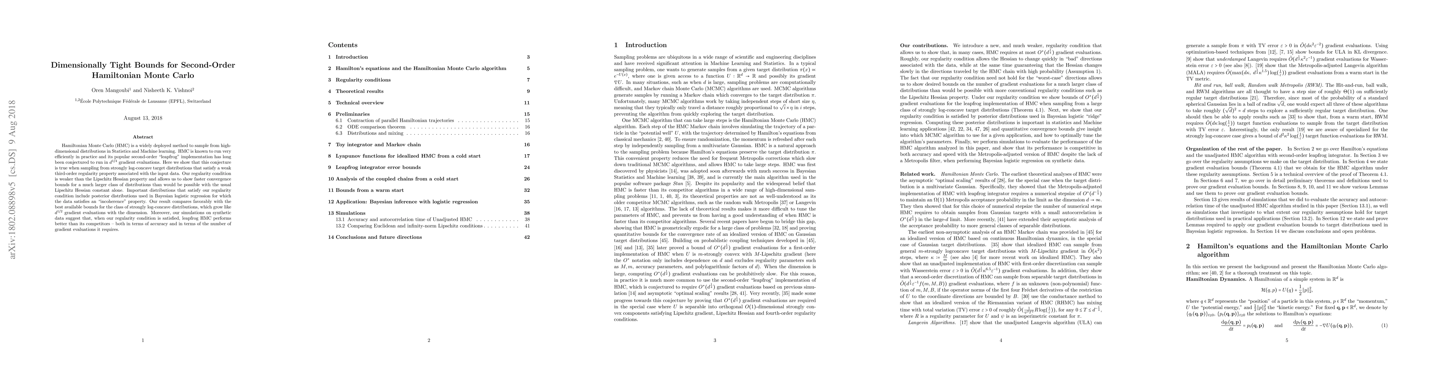 Hamiltonian Monte Carlo (HMC) is a widely deployed method to sample from high-dimensional distributions in Statistics and Machine learning. HMC is known to run very efficiently in practice and its popular second-order "leapfrog" implementation has long been conjectured to run in $d^{1/4}$ gradient evaluations. Here we show that this conjecture is true when sampling from strongly log-concave target distributions that satisfy a weak third-order regularity property associated with the input data. Our regularity condition is weaker than the Lipschitz Hessian property and allows us to show faster convergence bounds for a much larger class of distributions than would be possible with the usual Lipschitz Hessian constant alone. Important distributions that satisfy our regularity condition include posterior distributions used in Bayesian logistic regression for which the data satisfies an "incoherence" property. Our result compares favorably with the best available bounds for the class of strongly log-concave distributions, which grow like $d^{{1}/{2}}$ gradient evaluations with the dimension. Moreover, our simulations on synthetic data suggest that, when our regularity condition is satisfied, leapfrog HMC performs better than its competitors -- both in terms of accuracy and in terms of the number of gradient evaluations it requires.