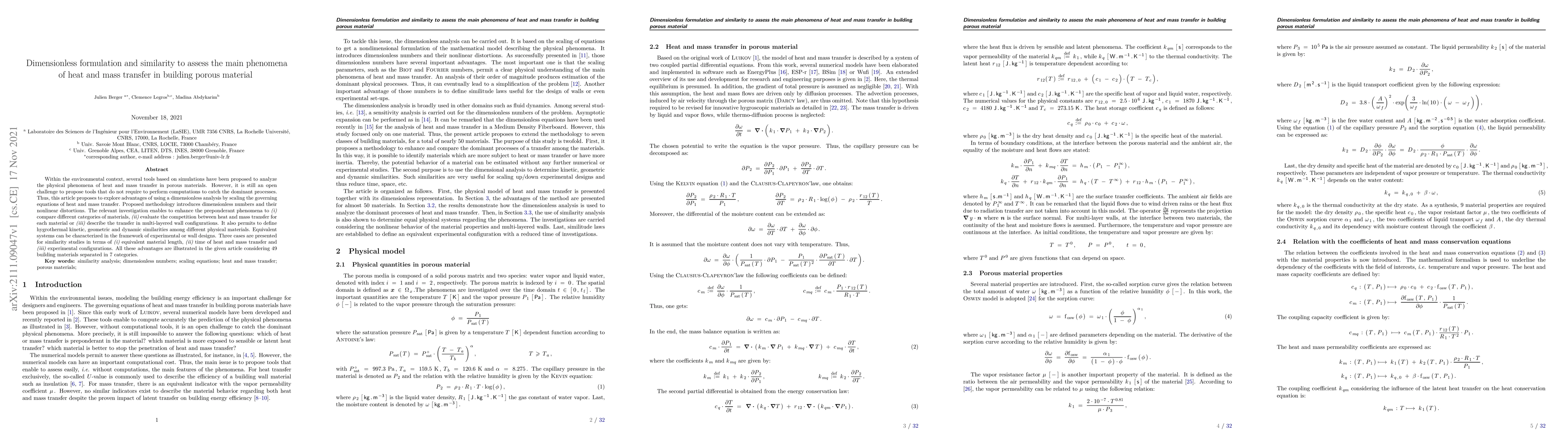 This paper proposes a dimensionless analysis method for heat and mass transfer in building porous materials, introducing dimensionless numbers and their distortions. The method facilitates comparing materials, evaluating heat vs mass transfer competition, and describing transfer in multi-layered walls, illustrated with 49 building materials across 7 categories.
