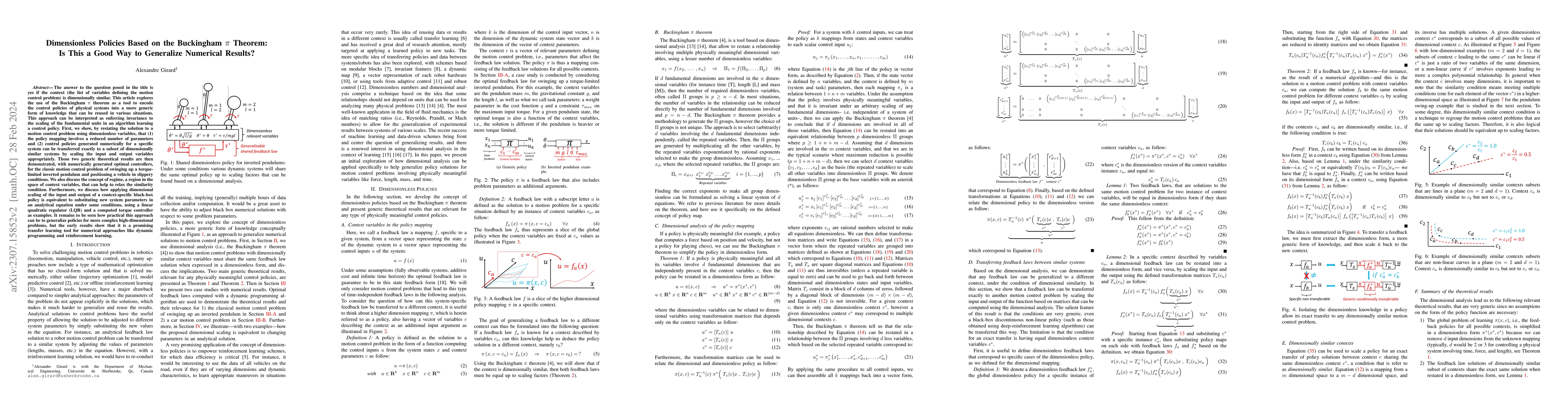 This paper demonstrates that the Buckingham $\pi$ theorem can generalize numerical control policies by encoding them in dimensionless form, reducing parameters and enabling exact transfer between dimensionally similar systems. The approach is tested on classic motion control problems, showing promising results for transfer learning in dynamic programming and reinforcement learning.