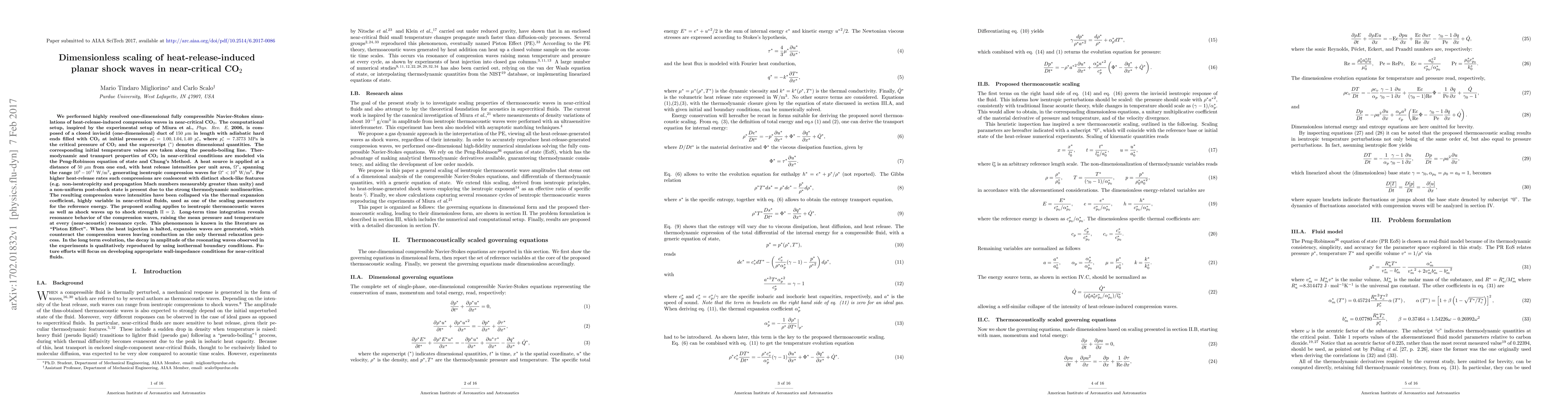 We performed highly resolved one-dimensional fully compressible Navier-Stokes simulations of heat-release-induced compression waves in near-critical CO2. The computational setup, inspired by the experimental setup of Miura et al., Phys. Rev. E, 2006, is composed of a closed inviscid (one-dimensional) duct with adiabatic hard ends filled with CO2 at three supercritical pressures. The corresponding initial temperature values are taken along the pseudo-boiling line. Thermodynamic and transport properties of CO2 in near-critical conditions are modeled via the Peng-Robinson equation of state and Chung's Method. A heat source is applied at a distance from one end, with heat release intensities spanning the range 10^3-10^11 W/m^2, generating isentropic compression waves for values < 10^9 W/m^2. For higher heat-release rates such compressions are coalescent with distinct shock-like features (e.g. non-isentropicity and propagation Mach numbers measurably greater than unity) and a non-uniform post-shock state is present due to the strong thermodynamic nonlinearities. The resulting compression wave intensities have been collapsed via the thermal expansion coefficient, highly variable in near-critical fluids, used as one of the scaling parameters for the reference energy. The proposed scaling applies to isentropic thermoacoustic waves as well as shock waves up to shock strength 2. Long-term time integration reveals resonance behavior of the compression waves, raising the mean pressure and temperature at every resonance cycle. When the heat injection is halted, expansion waves are generated, which counteract the compression waves leaving conduction as the only thermal relaxation process. In the long term evolution, the decay in amplitude of the resonating waves observed in the experiments is qualitatively reproduced by using isothermal boundary conditions.