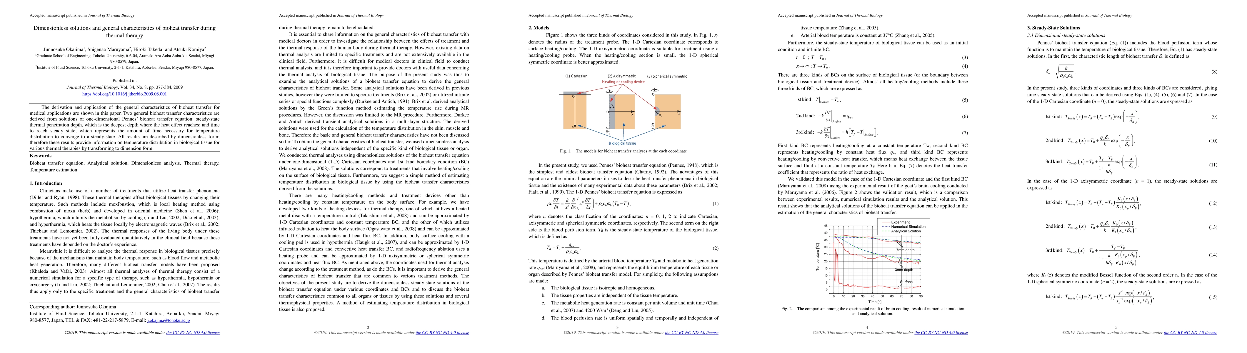 The derivation and application of the general characteristics of bioheat transfer for medical applications are shown in this paper. Two general bioheat transfer characteristics are derived from solutions of one-dimensional Pennes' bioheat transfer equation; steady-state thermal penetration depth, which is the deepest depth where the heat effect reaches; and time to reach steady state, which represents the amount of time necessary for temperature distribution to converge to a steady-state. All results are described by dimensionless form; therefore these results provide information on temperature distribution in biological tissue for various thermal therapies by transforming to dimension form.