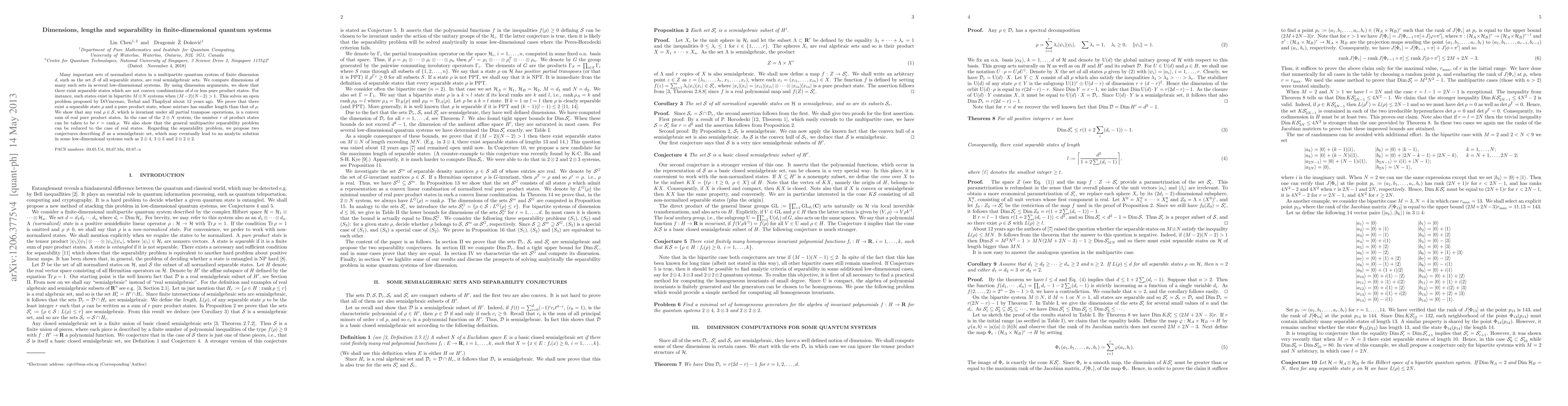 Many important sets of normalized states in a multipartite quantum system of finite dimension d, such as the set S of all separable states, are real semialgebraic sets. We compute dimensions of many such sets in several low-dimensional systems. By using dimension arguments, we show that there exist separable states which are not convex combinations of d or less pure product states. For instance, such states exist in bipartite M x N systems when (M-1)(N-1)>1. This solves an open problem proposed in [J. Mod. Opt. 47 (2000), 377-385]. We prove that there exist a separable state rho and a pure product state, whose mixture has smaller length than that of rho. We show that any real rho in S, which is invariant under all partial transpose operations, is a convex sum of real pure product states. In the case of the 2 x N system, the number r of product states can be taken to be r=rank(rho). We also show that the general multipartite separability problem can be reduced to the case of real states. Regarding the separability problem, we propose two conjectures describing S as a semialgebraic set, which may eventually lead to an analytic solution in some low-dimensional systems such as 2 x 4, 3 x 3 and 2 x 2 x 2.