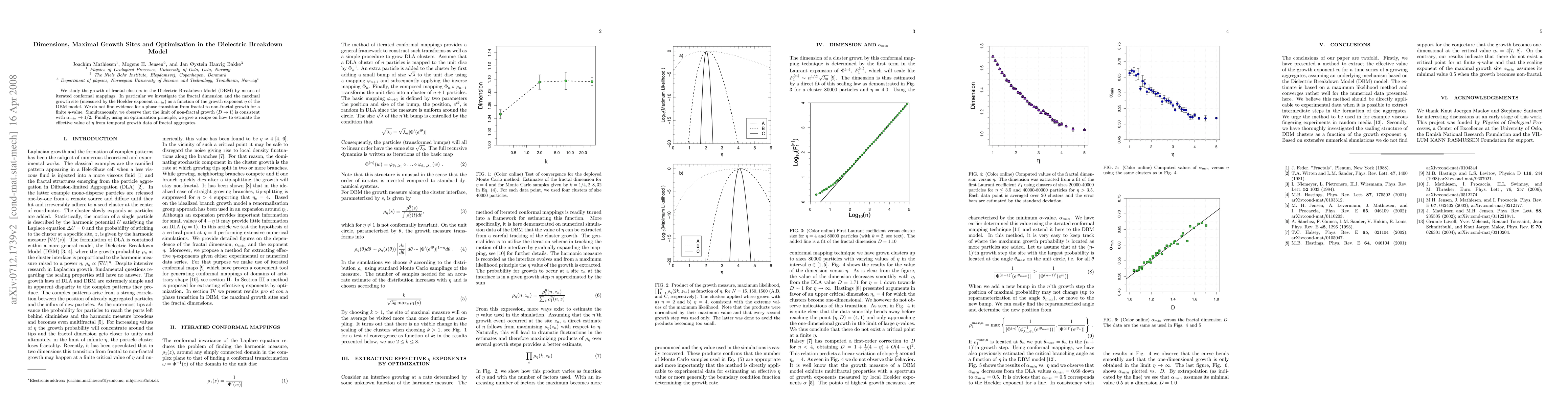 We study the growth of fractal clusters in the Dielectric Breakdown Model (DBM) by means of iterated conformal mappings. In particular we investigate the fractal dimension and the maximal growth site (measured by the Hoelder exponent $\alpha_{min}$) as a function of the growth exponent $\eta$ of the DBM model. We do not find evidence for a phase transition from fractal to non-fractal growth for a finite $\eta$-value. Simultaneously, we observe that the limit of non-fractal growth ($D\to 1$) is consistent with $\alpha_{min} \to 1/2$. Finally, using an optimization principle, we give a recipe on how to estimate the effective value of $\eta$ from temporal growth data of fractal aggregates.