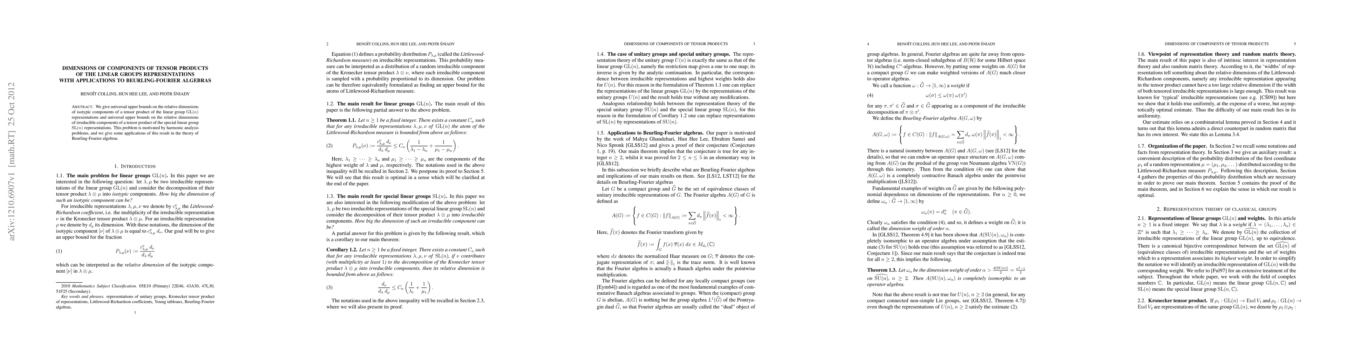 We give universal upper bounds on the relative dimensions of isotypic components of a tensor product of the linear group GL(n) representations and universal upper bounds on the relative dimensions of irreducible components of a tensor product of the special linear group SL(n) representations. This problem is motivated by harmonic analysis problems, and we give some applications of this result in the theory of Beurling-Fourier algebras.