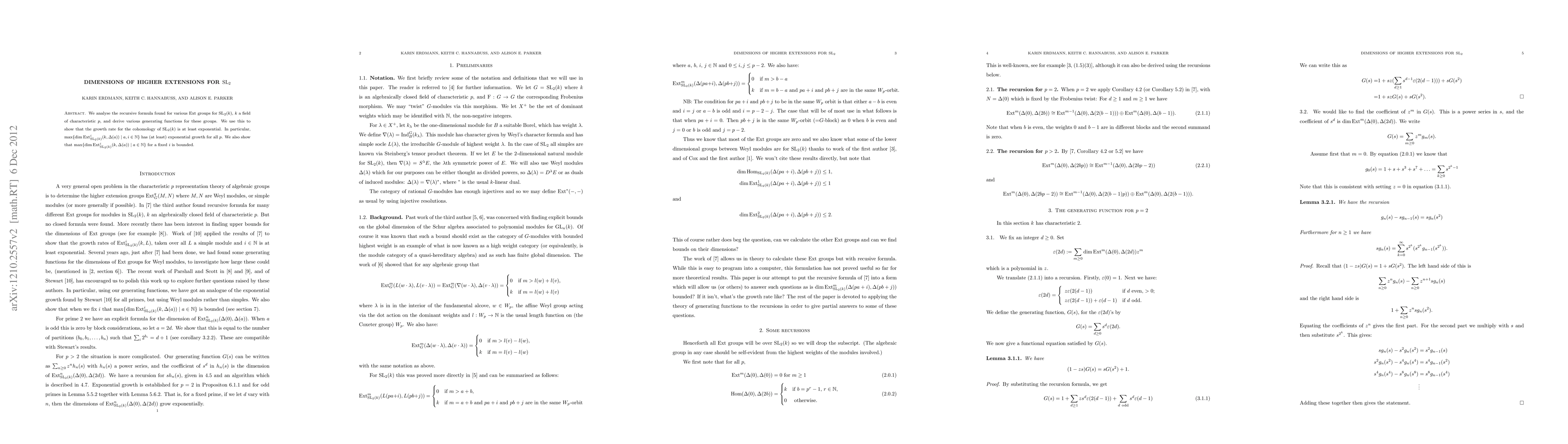 We analyse the recursive formula found for various Ext groups for $\SL_2(k)$, $k$ a field of characteristic $p$, and derive various generating functions for these groups. We use this to show that the growth rate for the cohomology of $\SL_2(k)$ is at least exponential. In particular, $\max \{\dim \Ext^i_{\SL_2(k)}(k, \Delta(a))\mid a,i \in \N \}$ has (at least) exponential growth for all $p$. We also show that $\max \{\dim \Ext^i_{\SL_2(k)}(k, \Delta(a))\mid a\in \N \}$ for a fixed $i$ is bounded.