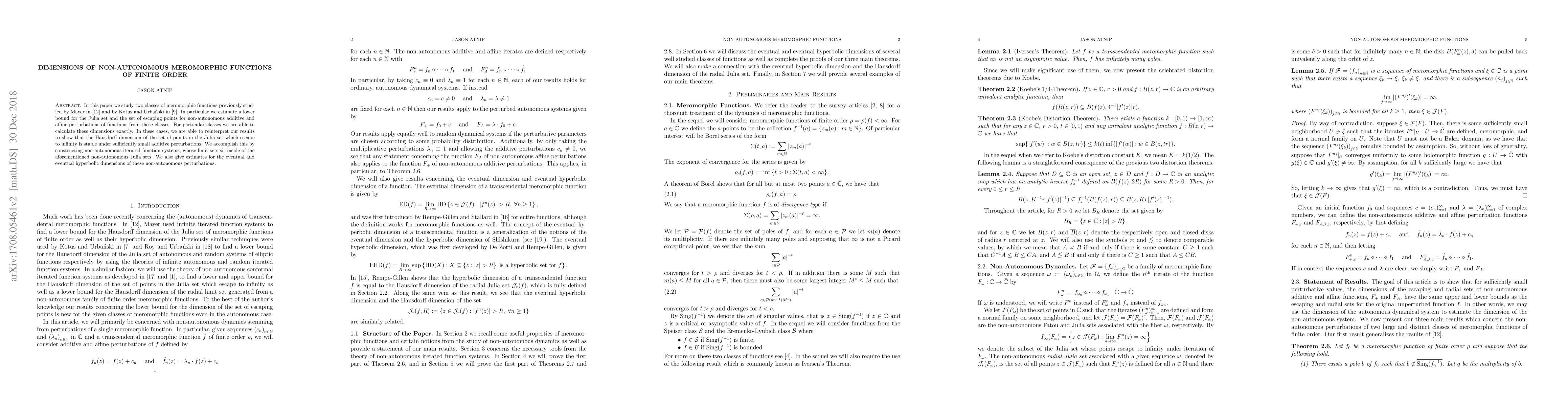 In this paper we study two classes of meromorphic functions previously studied by Mayer, Kotus, and Urba\'nski. In particular we estimate a lower bound for the Julia set and the set of escaping points for non-autonomous additive and affine perturbations of functions from these classes. For particular classes we are able to calculate these dimensions exactly. In these cases, we are able to reinterpret our results to show that the Hausdorff dimension of the set of points in the Julia set which escape to infinity is stable under sufficiently small additive perturbations. We accomplish this by constructing non-autonomous iterated function systems, whose limit sets sit inside of the aforementioned non-autonomous Julia sets. We also give estimates for the eventual and eventual hyperbolic dimensions of these non-autonomous perturbations.