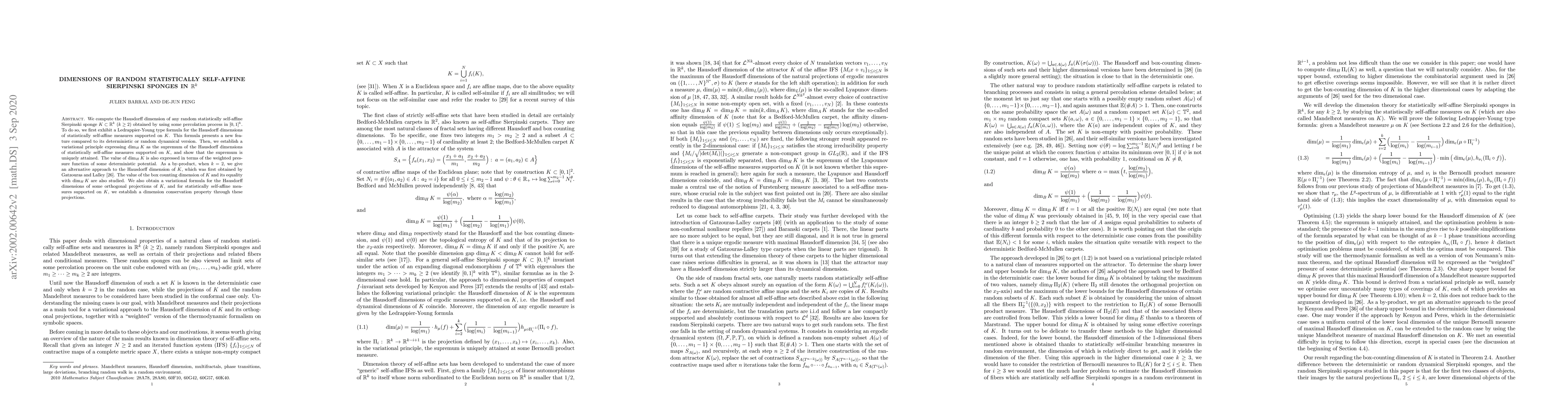 We compute the Hausdorff dimension of any random statistically self-affine Sierpinski sponge $K\subset \mathbb{R}^k$ ($k\ge 2$) obtained by using some percolation process in $[0,1]^k$. To do so, we first exhibit a Ledrappier-Young type formula for the Hausdorff dimensions of statistically self-affine measures supported on $K$. This formula presents a new feature compared to its deterministic or random dynamical version. Then, we establish a variational principle expressing $\dim_H K$ as the supremum of the Hausdorff dimensions of statistically self-affine measures supported on $K$, and show that the supremum is uniquely attained. The value of $\dim_H K$ is also expressed in terms of the weighted pressure function of some deterministic potential. As a by-product, when $k=2$, we give an alternative approach to the Hausdorff dimension of $K$, which was first obtained by Gatzouras and Lalley \cite{GL94}. The value of the box counting dimension of $K$ and its equality with $\dim_H K$ are also studied. We also obtain a variational formula for the Hausdorff dimensions of some orthogonal projections of $K$, and for statistically self-affine measures supported on~$K$, we establish a dimension conservation property through these projections.