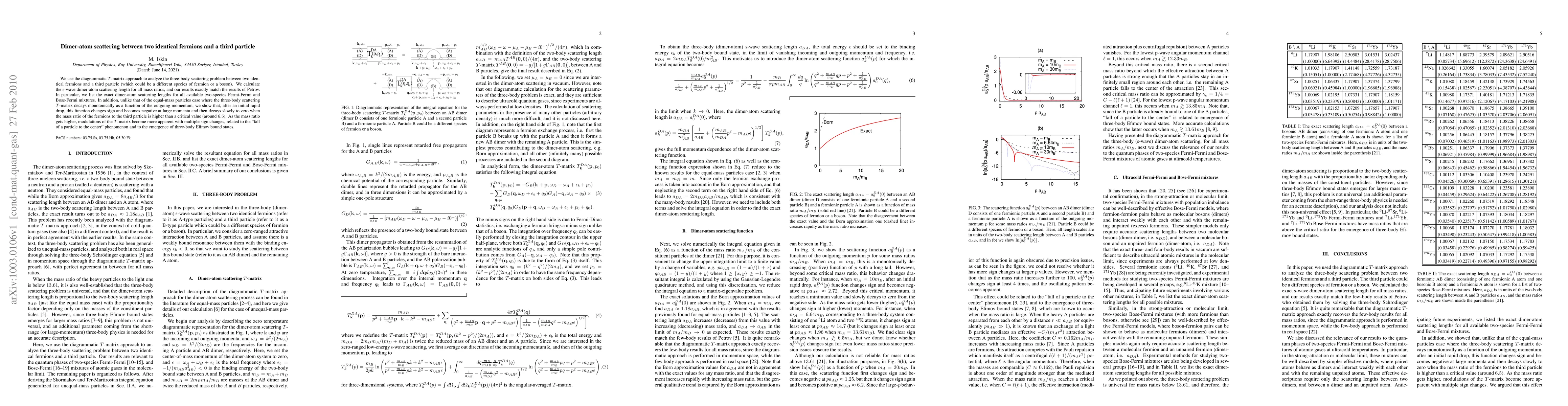 We use the diagrammatic $T$-matrix approach to analyze the three-body scattering problem between two identical fermions and a third particle (which could be a different species of fermion or a boson). We calculate the s-wave dimer-atom scattering length for all mass ratios, and our results exactly match the results of Petrov. In particular, we list the exact dimer-atom scattering lengths for all available two-species Fermi-Fermi and Bose-Fermi mixtures. In addition, unlike that of the equal-mass particles case where the three-body scattering $T$-matrix decays monotonically as a function of the outgoing momentum, we show that, after an initial rapid drop, this function changes sign and becomes negative at large momenta and then decays slowly to zero when the mass ratio of the fermions to the third particle is higher than a critical value (around 6.5). As the mass ratio gets higher, modulations of the $T$-matrix become more apparent with multiple sign changes, related to the "fall of a particle to the center" phenomenon and to the emergence of three-body Efimov bound states.