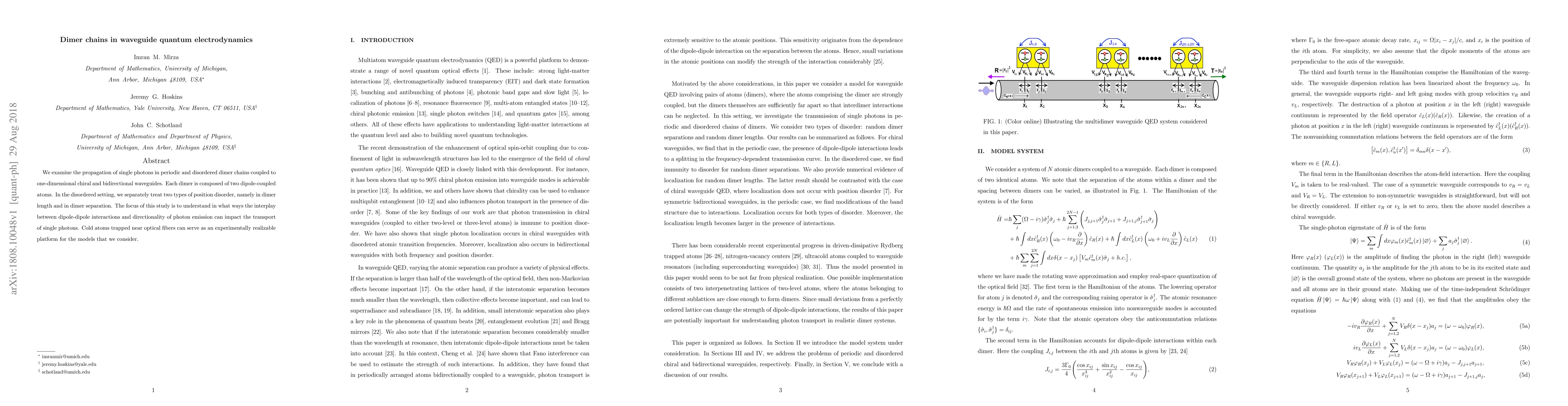 This paper investigates how single photons interact with dimer chains in waveguide quantum electrodynamics, exploring their transport in periodic and disordered structures.