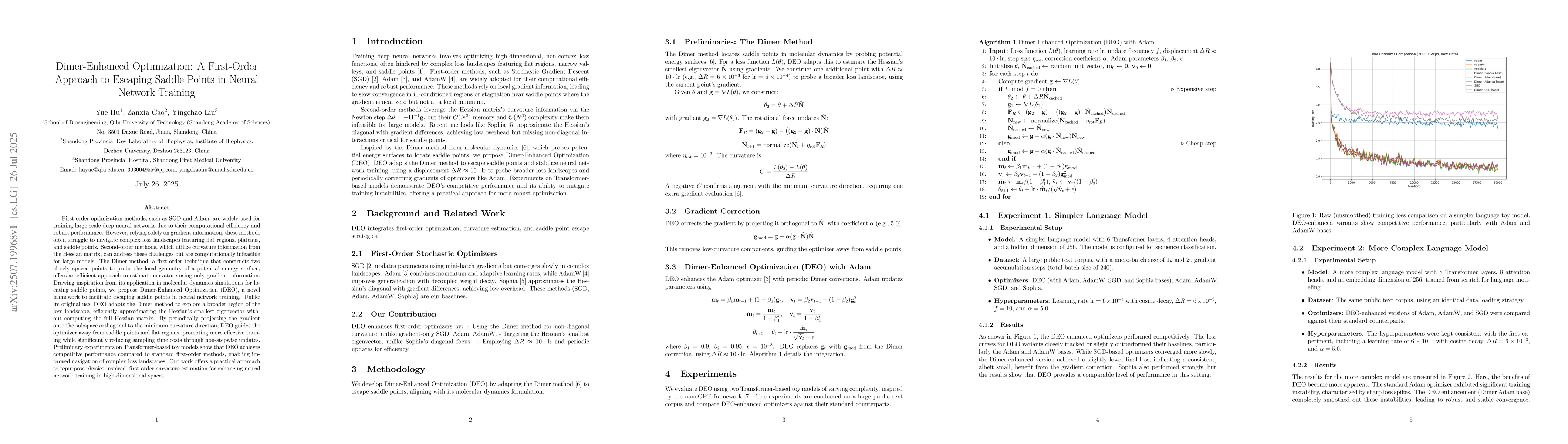 First-order optimization methods, such as SGD and Adam, are widely used for training large-scale deep neural networks due to their computational efficiency and robust performance. However, relying solely on gradient information, these methods often struggle to navigate complex loss landscapes with flat regions, plateaus, and saddle points. Second-order methods, which use curvature information from the Hessian matrix, can address these challenges but are computationally infeasible for large models. The Dimer method, a first-order technique that constructs two closely spaced points to probe the local geometry of a potential energy surface, efficiently estimates curvature using only gradient information. Inspired by its use in molecular dynamics simulations for locating saddle points, we propose Dimer-Enhanced Optimization (DEO), a novel framework to escape saddle points in neural network training. DEO adapts the Dimer method to explore a broader region of the loss landscape, approximating the Hessian's smallest eigenvector without computing the full matrix. By periodically projecting the gradient onto the subspace orthogonal to the minimum curvature direction, DEO guides the optimizer away from saddle points and flat regions, enhancing training efficiency with non-stepwise updates. Preliminary experiments on a Transformer toy model show DEO achieves competitive performance compared to standard first-order methods, improving navigation of complex loss landscapes. Our work repurposes physics-inspired, first-order curvature estimation to enhance neural network training in high-dimensional spaces.