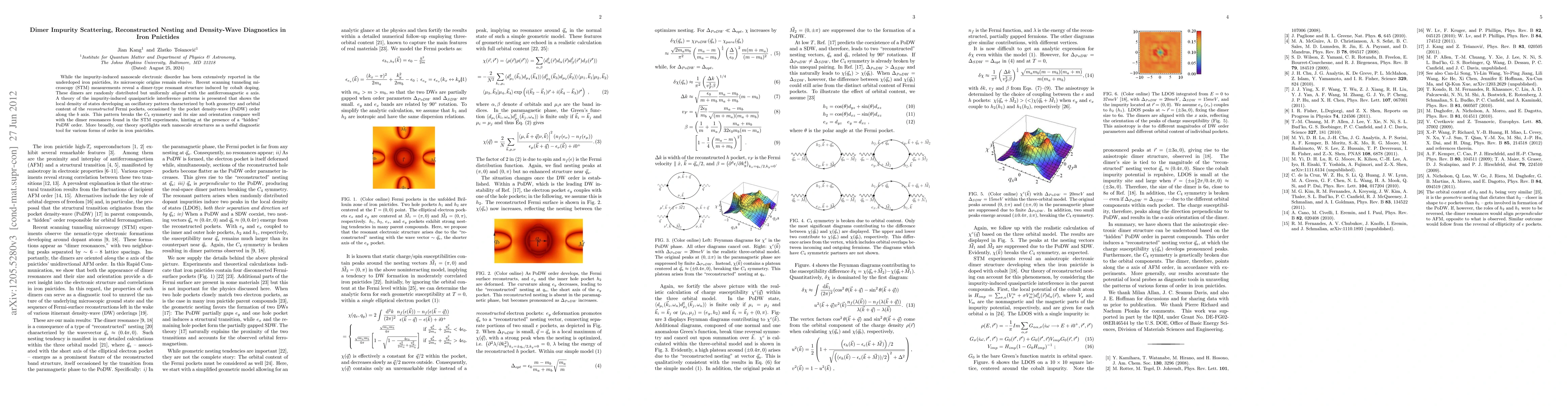 While the impurity-induced nanoscale electronic disorder has been extensively reported in the underdoped iron pnictides, its microscopic origins remain elusive. Recent scanning tunneling microscopy (STM) measurements reveal a dimer-type resonant structure induced by cobalt doping. These dimers are randomly distributed but uniformly aligned with the antiferromagnetic a axis. A theory of the impurity-induced quasiparticle interference patterns is presented that shows the local density of states developing an oscillatory pattern characterized by both geometry and orbital content of the {\em reconstructed} Fermi pockets, occasioned by the pocket density-wave (PoDW) order along the b axis. This pattern breaks the $C_4$ symmetry and its size and orientation compare well with the dimer resonances found in the STM experiments, hinting at the presence of a "hidden" PoDW order. More broadly, our theory spotlights such nanoscale structures as a useful diagnostic tool for various forms of order in iron pnictides.