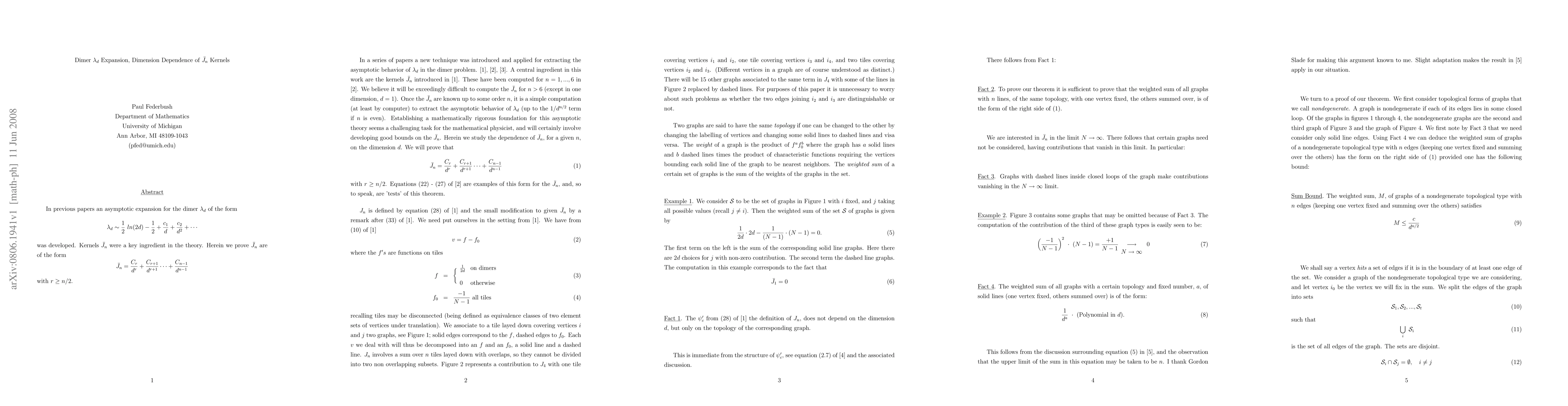 Researchers have proven that kernels J_n in a dimer lambda_d theory follow a specific pattern related to dimension d, with terms involving powers of 1/d.