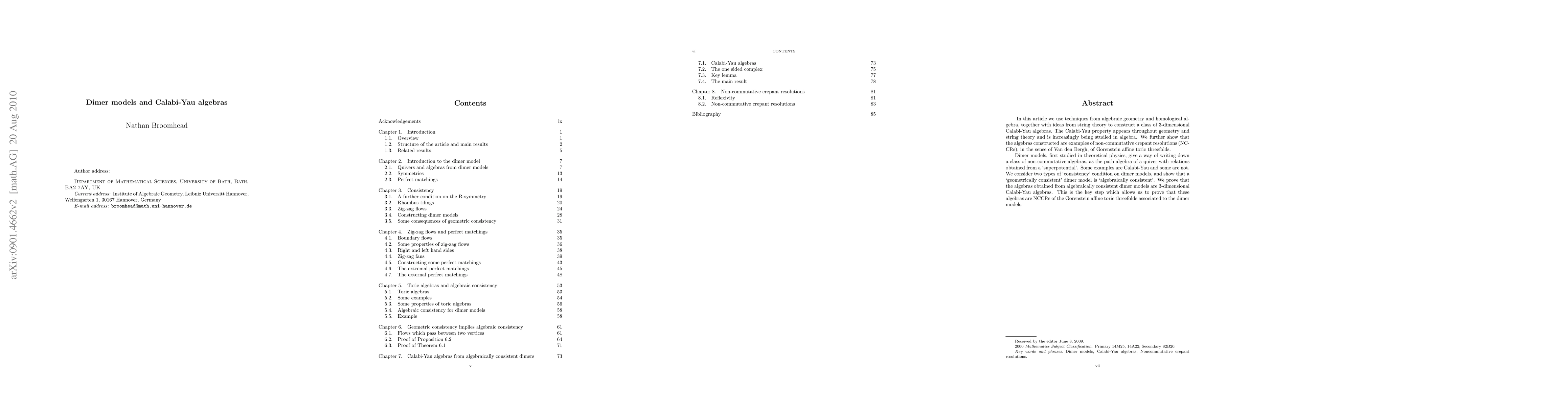 This paper investigates dimer models in string theory, showing that they generate non-commutative superpotential algebras, including 3-dimensional Calabi-Yau algebras. It establishes the equivalence between geometric and algebraic consistency conditions, proving that an algebraically consistent dimer model yields a 3-dimensional Calabi-Yau algebra and provides a non-commutative crepant resolution of the associated affine toric threefold.