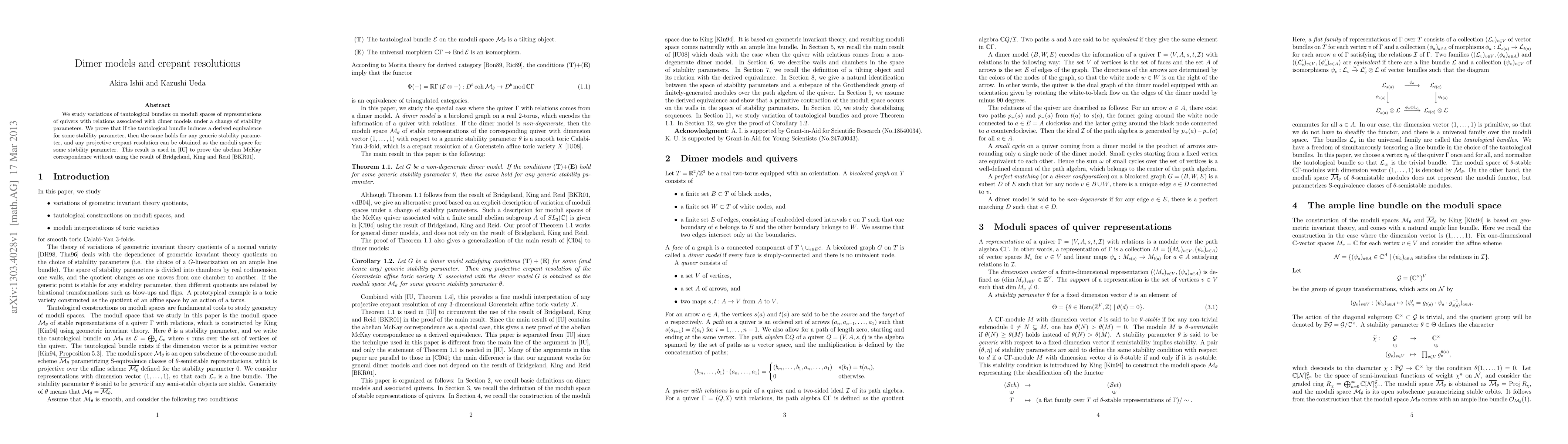 We study variations of tautological bundles on moduli spaces of representations of quivers with relations associated with dimer models under a change of stability parameters. We prove that if the tautological bundle induces a derived equivalence for some stability parameter, then the same holds for any generic stability parameter, and any projective crepant resolution can be obtained as the moduli space for some stability parameter. This result is used in 0905.0059 to prove the abelian McKay correspondence without using the result of math/9908027.