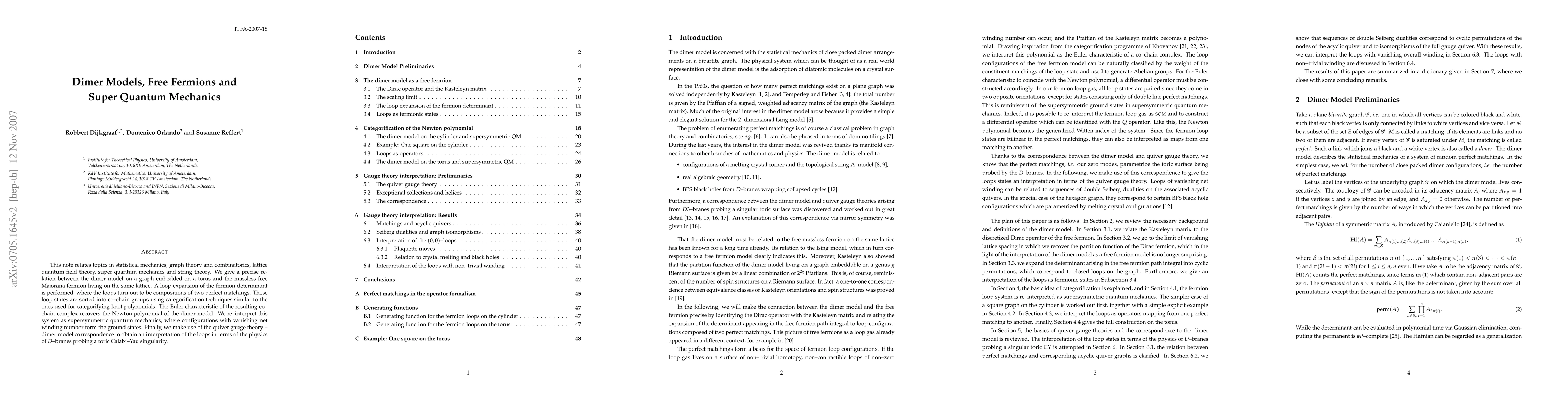 This note relates topics in statistical mechanics, graph theory and combinatorics, lattice quantum field theory, super quantum mechanics and string theory. We give a precise relation between the dimer model on a graph embedded on a torus and the massless free Majorana fermion living on the same lattice. A loop expansion of the fermion determinant is performed, where the loops turn out to be compositions of two perfect matchings. These loop states are sorted into co-chain groups using categorification techniques similar to the ones used for categorifying knot polynomials. The Euler characteristic of the resulting co-chain complex recovers the Newton polynomial of the dimer model. We re-interpret this system as supersymmetric quantum mechanics, where configurations with vanishing net winding number form the ground states. Finally, we make use of the quiver gauge theory - dimer model correspondence to obtain an interpretation of the loops in terms of the physics of D-branes probing a toric Calabi-Yau singularity.