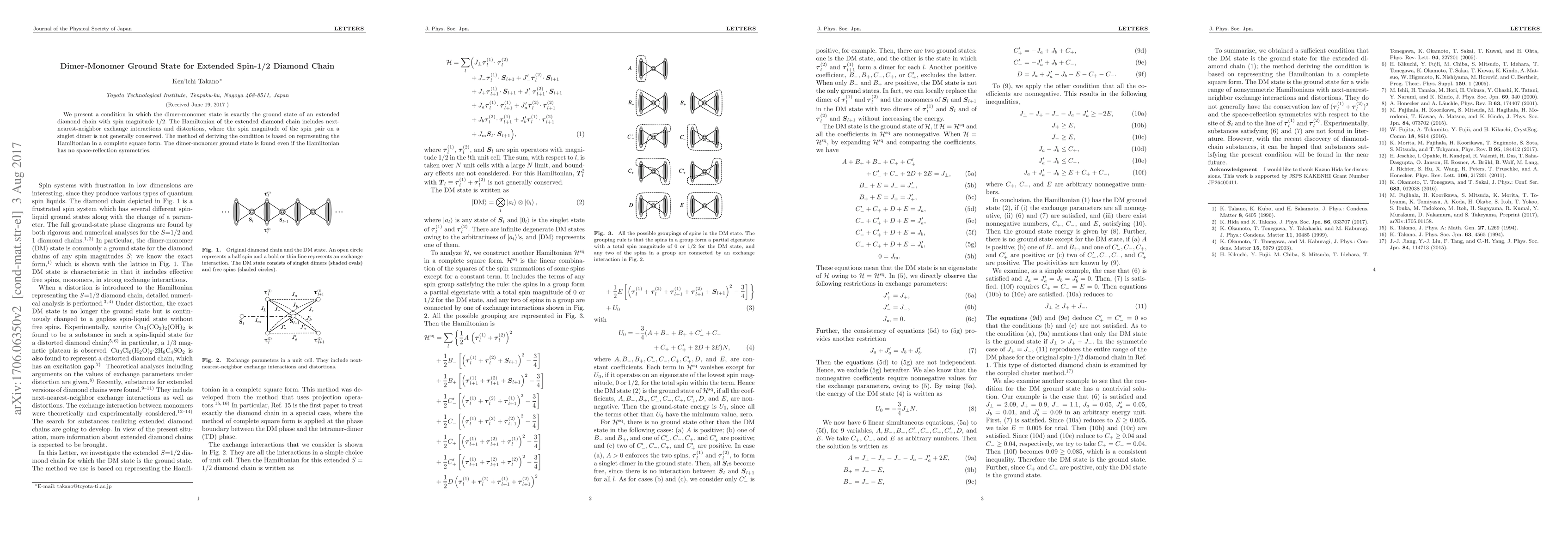 This paper establishes conditions for the dimer-monomer state to be the exact ground state of an extended spin-1/2 diamond chain with next-nearest-neighbor interactions and distortions. The method involves expressing the Hamiltonian in a complete square form, revealing the ground state even without space-reflection symmetries.