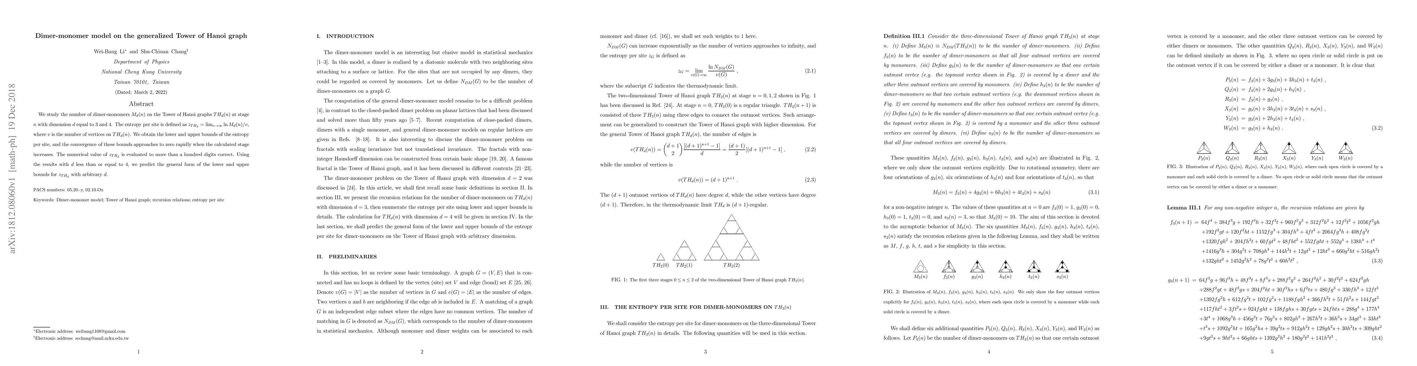 We study the number of dimer-monomers $M_d(n)$ on the Tower of Hanoi graphs $TH_d(n)$ at stage $n$ with dimension $d$ equal to 3 and 4. The entropy per site is defined as $z_{TH_d}=\lim_{v \to \infty} \ln M_d(n)/v$, where $v$ is the number of vertices on $TH_d(n)$. We obtain the lower and upper bounds of the entropy per site, and the convergence of these bounds approaches to zero rapidly when the calculated stage increases. The numerical value of $z_{TH_d}$ is evaluated to more than a hundred digits correct. Using the results with $d$ less than or equal to 4, we predict the general form of the lower and upper bounds for $z_{TH_d}$ with arbitrary $d$.