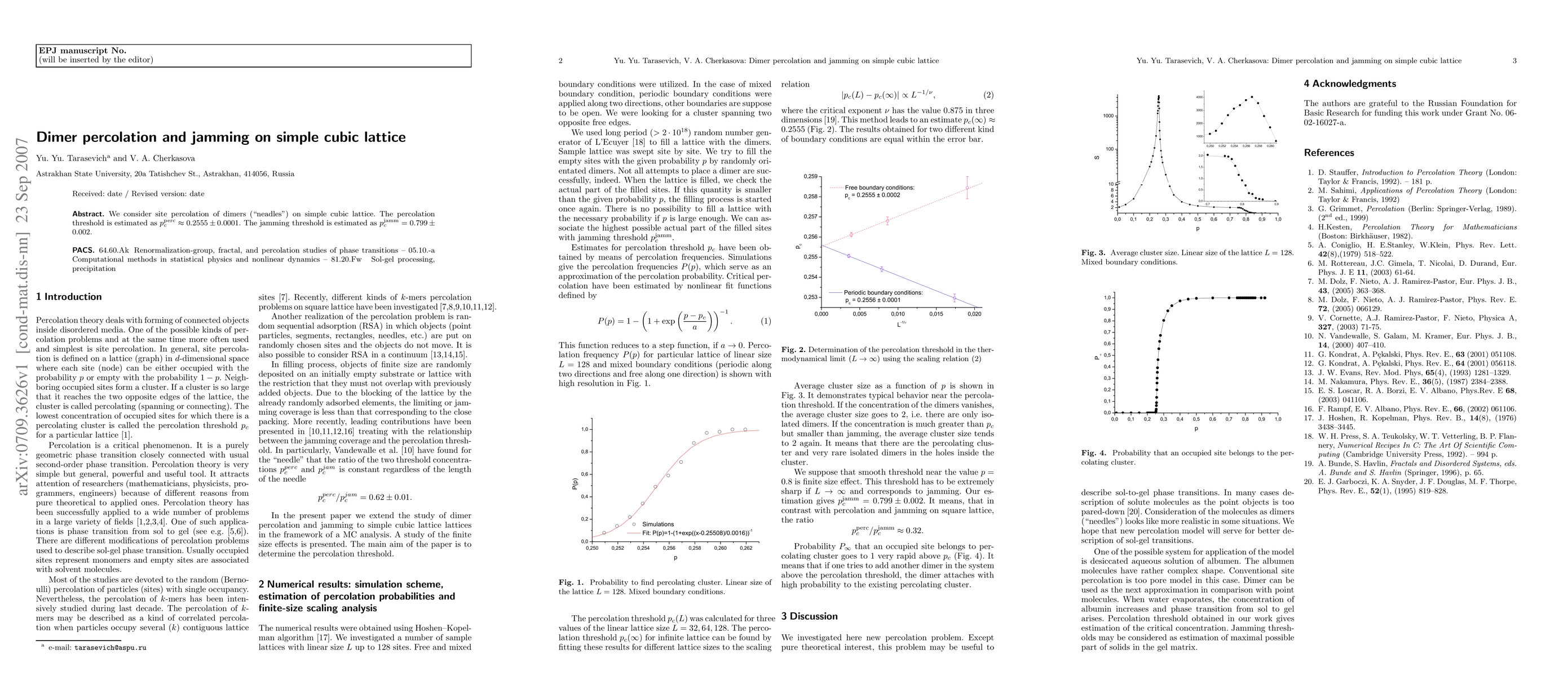 This study investigates dimer percolation and jamming on a simple cubic lattice, estimating the percolation threshold at $p_c^\text{perc} \approx 0.2555 \pm 0.0001$ and the jamming threshold at $p_c^\text{jamm} = 0.799 \pm 0.002$.