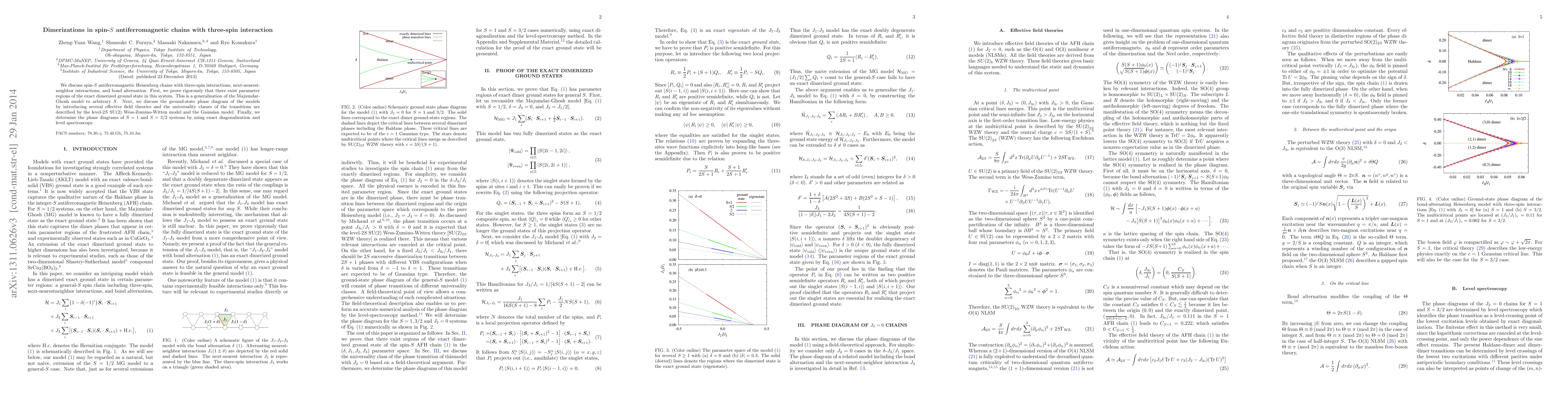 This paper rigorously proves the existence of exact dimerized ground states in spin-$S$ antiferromagnetic Heisenberg chains with three-spin interactions and bond alternation. It generalizes the Majumdar-Ghosh model to arbitrary spin values and determines phase diagrams for $S=1$ and $S=3/2$ using exact diagonalization and level spectroscopy.