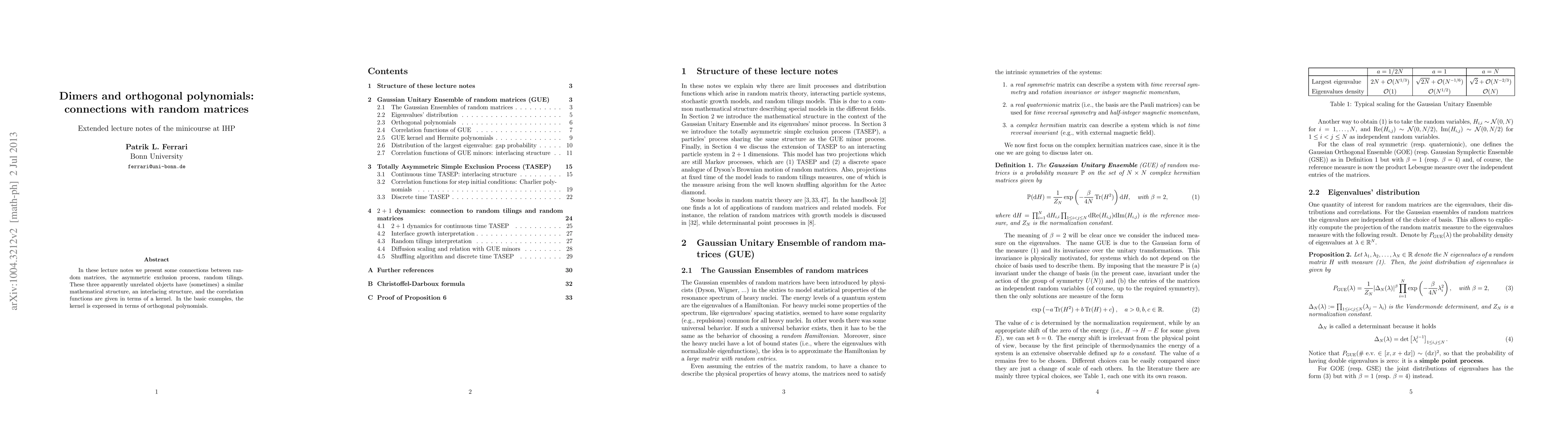 This paper explores connections between random matrices, asymmetric exclusion processes, and random tilings, revealing a shared mathematical structure and interlacing patterns, often expressed through orthogonal polynomials.