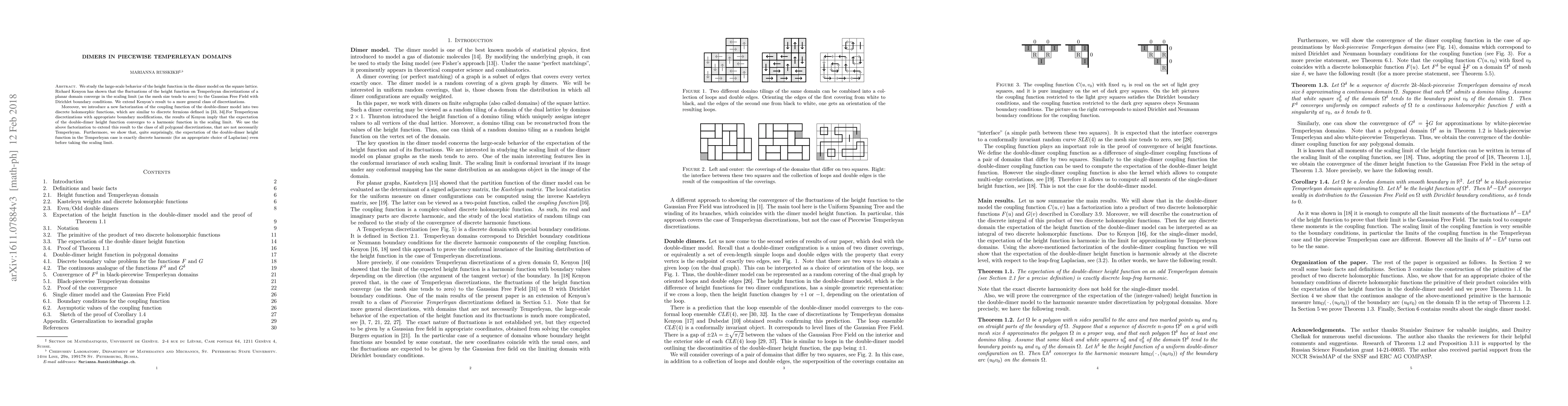 We study the large-scale behavior of the height function in the dimer model on the square lattice. Richard Kenyon has shown that the fluctuations of the height function on Temperleyan discretizations of a planar domain converge in the scaling limit (as the mesh size tends to zero) to the Gaussian Free Field with Dirichlet boundary conditions. We extend Kenyon's result to a more general class of discretizations. Moreover, we introduce a new factorization of the coupling function of the double-dimer model into two discrete holomorphic functions, which are similar to discrete fermions defined in [Stas, Stas07].For Temperleyan discretizations with appropriate boundary modifications, the results of Kenyon imply that the expectation of the double-dimer height function converges to a harmonic function in the scaling limit. We use the above factorization to extend this result to the class of all polygonal discretizations, that are not necessarily Temperleyan. Furthermore, we show that, quite surprisingly, the expectation of the double-dimer height function in the Temperleyan case is exactly discrete harmonic (for an appropriate choice of Laplacian) even before taking the scaling limit.