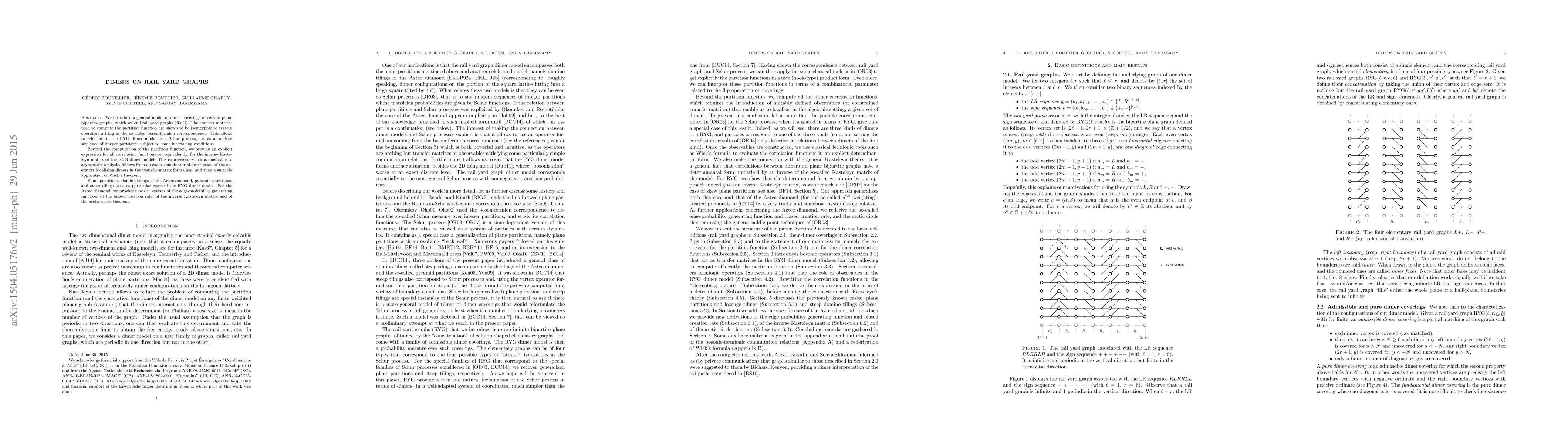 We introduce a general model of dimer coverings of certain plane bipartite graphs, which we call rail yard graphs (RYG). The transfer matrices used to compute the partition function are shown to be isomorphic to certain operators arising in the so-called boson-fermion correspondence. This allows to reformulate the RYG dimer model as a Schur process, i.e. as a random sequence of integer partitions subject to some interlacing conditions. Beyond the computation of the partition function, we provide an explicit expression for all correlation functions or, equivalently, for the inverse Kasteleyn matrix of the RYG dimer model. This expression, which is amenable to asymptotic analysis, follows from an exact combinatorial description of the operators localizing dimers in the transfer-matrix formalism, and then a suitable application of Wick's theorem. Plane partitions, domino tilings of the Aztec diamond, pyramid partitions, and steep tilings arise as particular cases of the RYG dimer model. For the Aztec diamond, we provide new derivations of the edge-probability generating function, of the biased creation rate, of the inverse Kasteleyn matrix and of the arctic circle theorem.