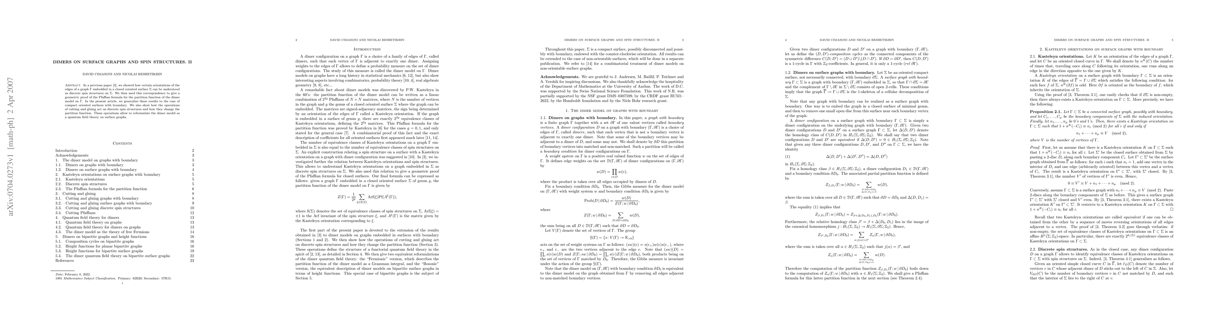 In a previous paper, we showed how certain orientations of the edges of a graph G embedded in a closed oriented surface S can be understood as discrete spin structures on S. We then used this correspondence to give a geometric proof of the Pfaffian formula for the partition function of the dimer model on G. In the present article, we generalize these results to the case of compact oriented surfaces with boundary. We also show how the operations of cutting and gluing act on discrete spin structures and how they change the partition function. These operations allow to reformulate the dimer model as a quantum field theory on surface graphs.