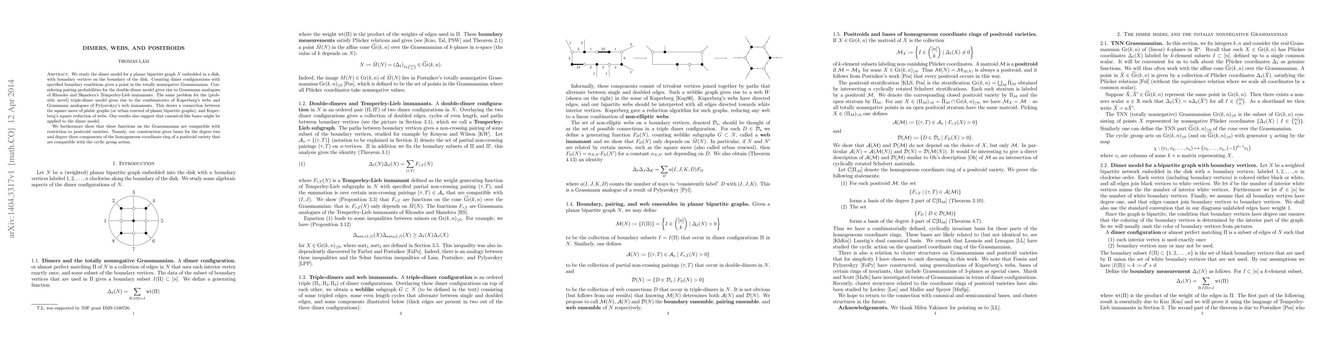 This paper explores the dimer model's combinatorial structures, linking them to Grassmannians and positroid varieties. It reveals connections between dimer configurations, webs, and canonical bases, and demonstrates compatibility with positroid varieties' homogeneous coordinate rings.