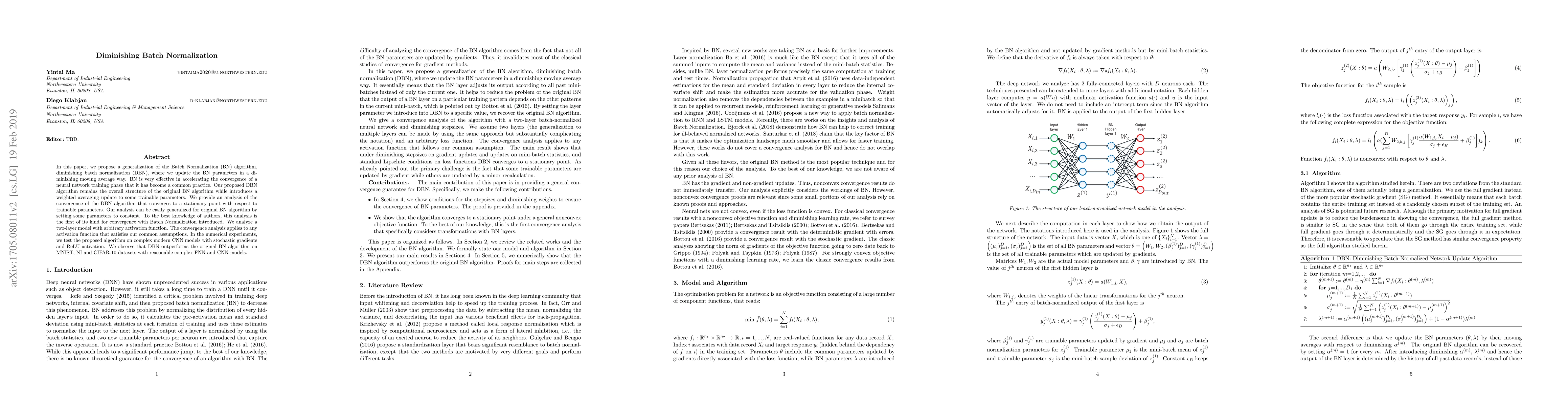 In this paper, we propose a generalization of the Batch Normalization (BN) algorithm, diminishing batch normalization (DBN), where we update the BN parameters in a diminishing moving average way. BN is very effective in accelerating the convergence of a neural network training phase that it has become a common practice. Our proposed DBN algorithm remains the overall structure of the original BN algorithm while introduces a weighted averaging update to some trainable parameters. We provide an analysis of the convergence of the DBN algorithm that converges to a stationary point with respect to trainable parameters. Our analysis can be easily generalized for original BN algorithm by setting some parameters to constant. To the best knowledge of authors, this analysis is the first of its kind for convergence with Batch Normalization introduced. We analyze a two-layer model with arbitrary activation function. The primary challenge of the analysis is the fact that some parameters are updated by gradient while others are not. The convergence analysis applies to any activation function that satisfies our common assumptions. In the numerical experiments, we test the proposed algorithm on complex modern CNN models with stochastic gradients and ReLU activation. We observe that DBN outperforms the original BN algorithm on MNIST, NI and CIFAR-10 datasets with reasonable complex FNN and CNN models.