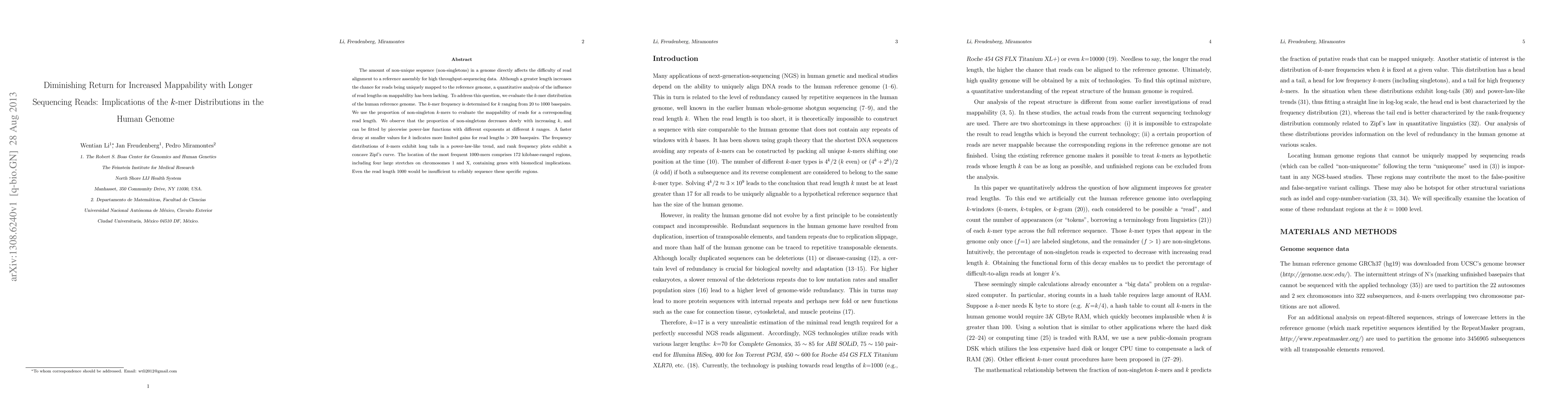 This study investigates the relationship between k-mer distributions and mappability in the human genome, finding diminishing returns for read lengths beyond 200 basepairs. The analysis shows that while longer reads improve mappability, the benefits plateau, and regions with high non-singleton k-mer frequency remain challenging to sequence even with 1000-basepair reads.