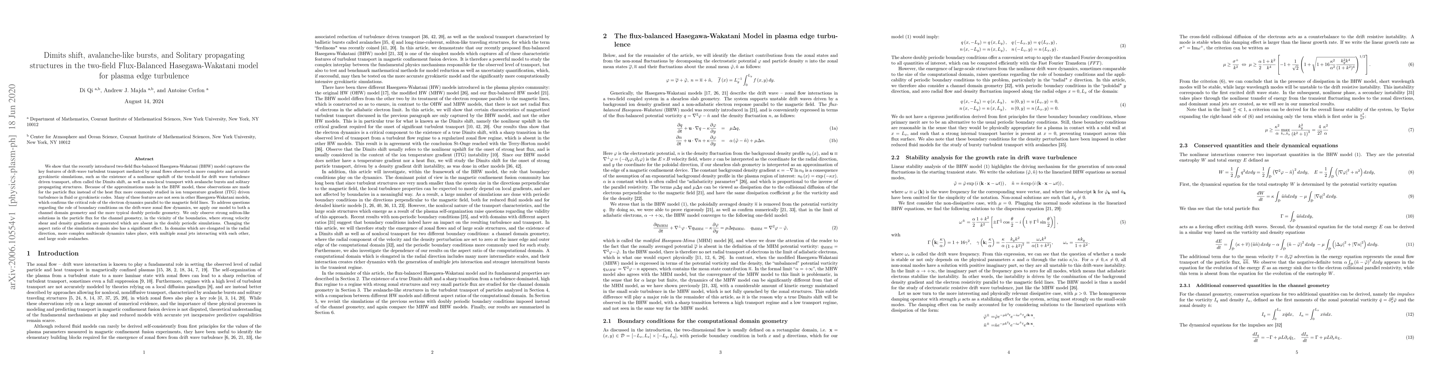 This paper investigates the two-field flux-balanced Hasegawa-Wakatani model for plasma edge turbulence, revealing the Dimits shift, avalanche bursts, and solitary structures in particle flux. The model highlights the importance of electron dynamics parallel to magnetic field lines, showing distinct behavior in channel versus doubly periodic geometries.