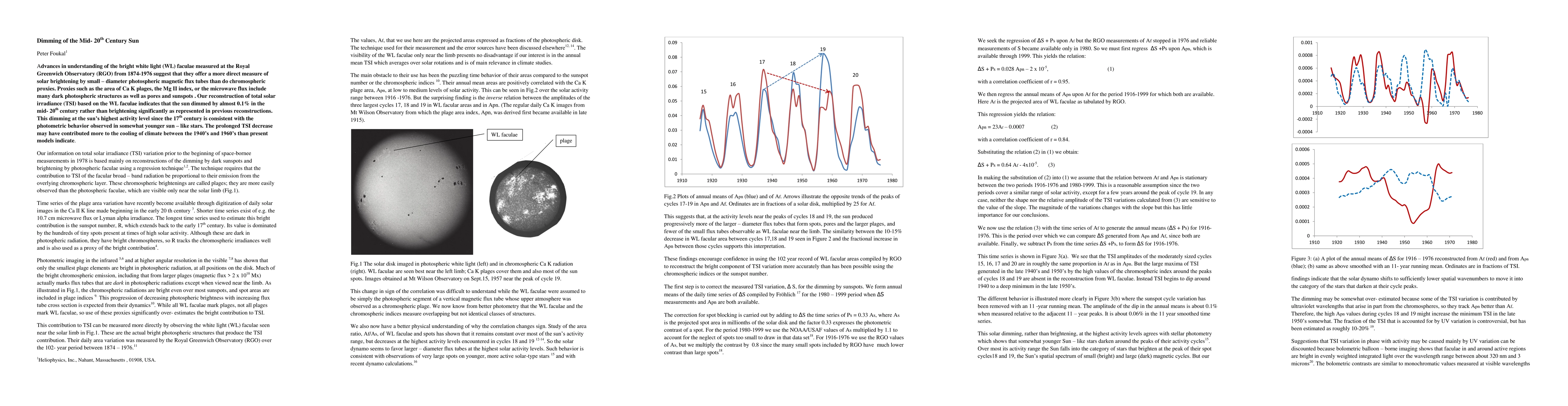This research suggests the Sun dimmed by nearly 0.1% in the mid-20th century, contradicting previous reconstructions. The finding is based on studying white light faculae at the Royal Greenwich Observatory, which more directly measure solar brightening than earlier used proxies like Ca K plages or Mg index.