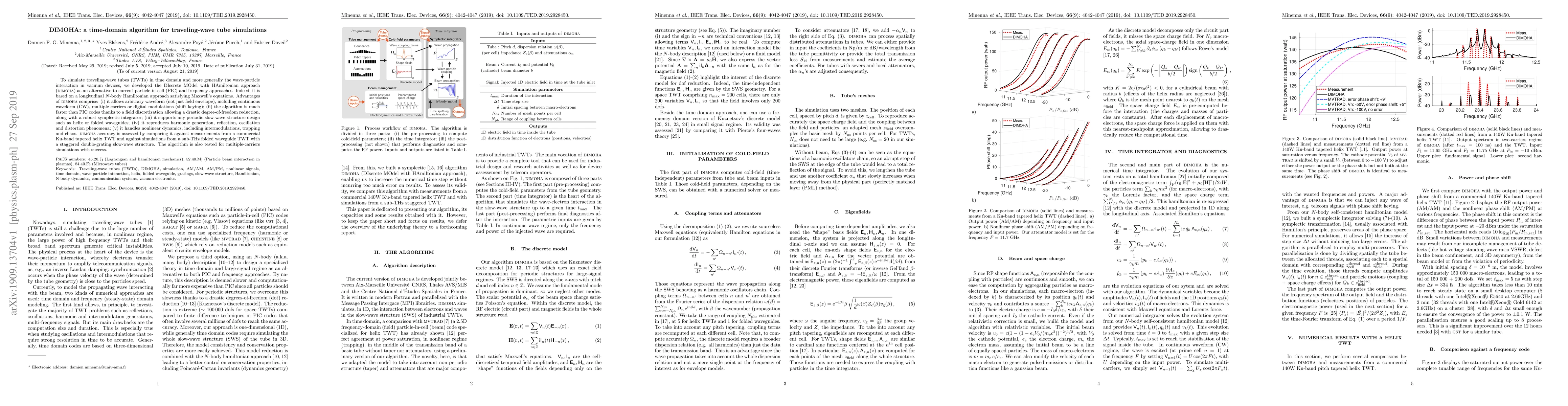 To simulate traveling-wave tubes (TWTs) in time domain and more generally the wave-particle interaction in vacuum devices, we developed the DIscrete MOdel with HAmiltonian approach (dimoha) as an alternative to current particle-in-cell (PIC) and frequency approaches. Indeed, it is based on a longitudinal N-body Hamiltonian approach satisfying Maxwell's equations. Advantages of dimoha comprise: (i) it allows arbitrary waveform (not just field envelope), including continuous waveform (CW), multiple carriers or digital modulations (shift keying); (ii) the algorithm is much faster than PIC codes thanks to a field discretization allowing a drastic degree-of-freedom reduction, along with a robust symplectic integrator; (iii) it supports any periodic slow-wave structure design such as helix or folded waveguides; (iv) it reproduces harmonic generation, reflection, oscillation and distortion phenomena; (v) it handles nonlinear dynamics, including intermodulations, trapping and chaos. dimoha accuracy is assessed by comparing it against measurements from a commercial Ku-band tapered helix TWT and against simulations from a sub-THz folded waveguide TWT with a staggered double-grating slow-wave structure. The algorithm is also tested for multiple-carriers simulations with success.