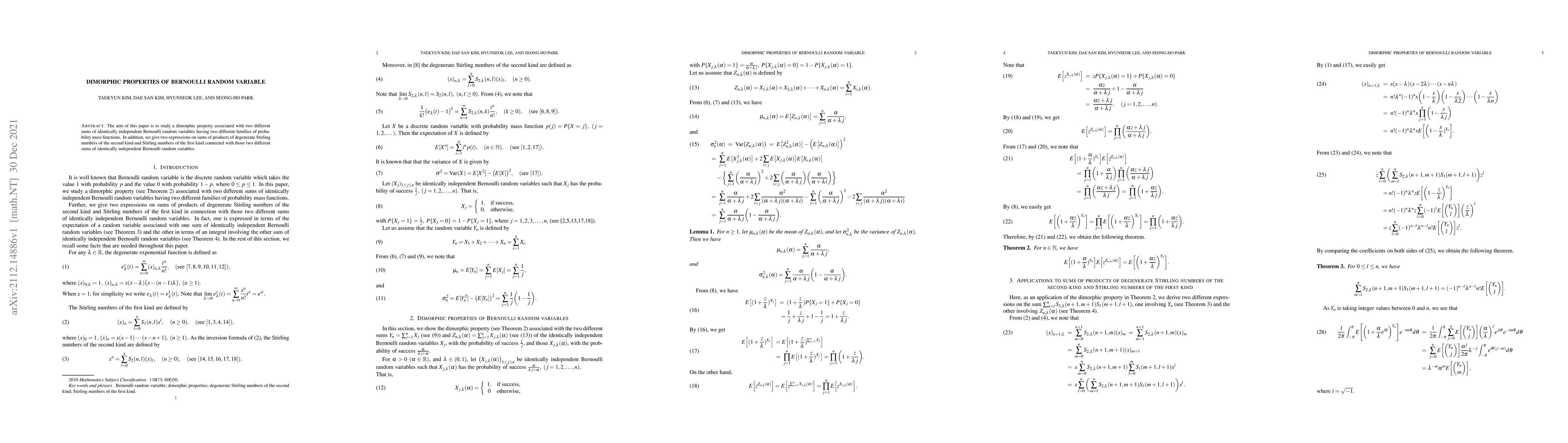 The aim of this paper is to study a dimorphic property associated with two different sums of identically independent Bernoulli random variables having two different families of probability mass functions. In addition, we give two expressions on sums of products of degenerate Stirling numbers of the second kind and Stirling numbers of the first kind connected with those two different sums of identically independent Bernoulli random variables.