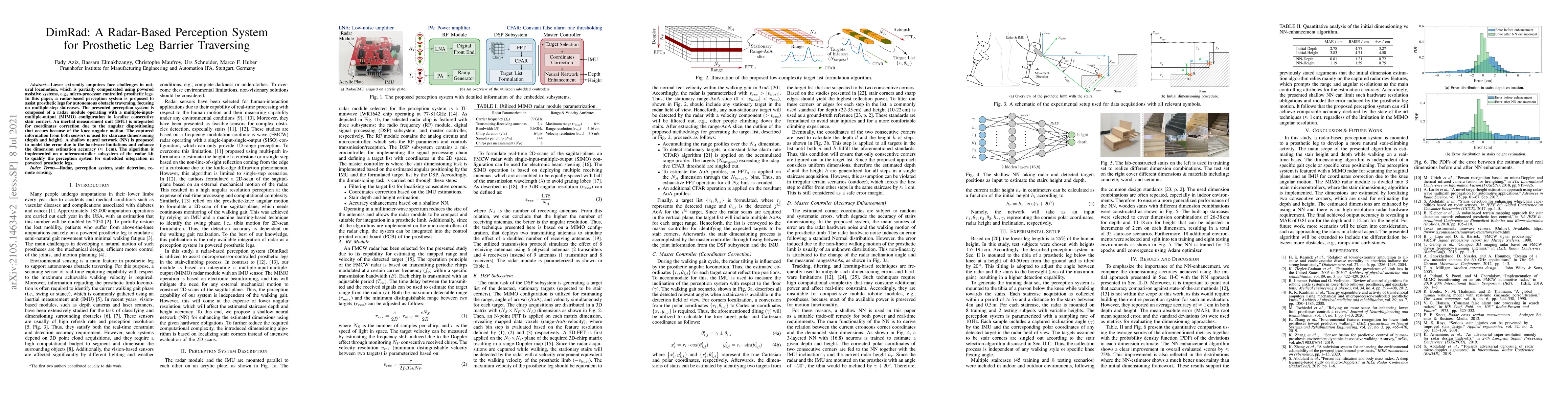 Lower extremity amputees face challenges in natural locomotion, which is partially compensated using powered assistive systems, e.g., micro-processor controlled prosthetic leg. In this paper, a radar-based perception system is proposed to assist prosthetic legs for autonomous obstacle traversing, focusing on multiple-step staircases. The presented perception system is composed of a radar module operating with a multiple-input-multiple-output (MIMO) configuration to localize consecutive stair corners. An inertial measurement unit (IMU) is integrated for coordinates correction due to the angular dis-positioning that occurs because of the knee angular motion. The captured information from both sensors is used for staircase dimensioning (depth and height). A shallow neural network (NN) is proposed to model the error due to the hardware limitations and enhance the dimension estimation accuracy (1 cm). The algorithm is implemented on a microcontroller subsystem of the radar kit to qualify the perception system for embedded integration in powered prosthetic legs.